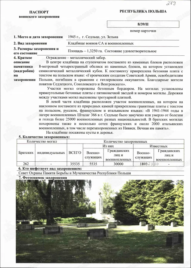 | Информация о захоронении Страна захоронения Польша Регион захоронения Мазовецкое воев. Номер захоронения в ВМЦ З48-279 Первичное место захоронения г. Седльце, ул. Зельна Дата создания современного места захоронения __.__.1945 Дата последнего захоронения __.__.1945 Вид захоронения кладбище воинов СА и военнопленных Состояние захоронения удовлетворительное Количество могил 262 Захоронено всего 35535 Захоронено известных 2000 Захоронено неизвестных 33535 Кто шефствует над захоронением Совет Охраны Памяти Борьбы и Мученичества Республики Польши http://www.obd-memorial.ru/html/info.htm?id=86244432