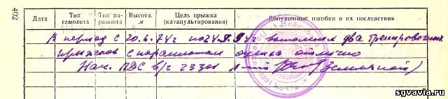 Саня, Каждый год до 35 лет, лётный состав должен был 1 раз в год прыгнуть с парашютом. И должна была быть запись в лётную книжку. На фрагменте снимка видно исправления. Там было записано количество прыжков, чтобы я набрал на кандидата в мастера спорта. Это надо было для баллов. Проводились в это время соревнования по спортивным мероприятиям в ВВС среди полков. Нас лейтенантов в полку было 18 человек. И командование решило добрать баллы на парашютных прыжках за счёт нас. Всем сделали количество прыжков в лётной книжке до уровня в кандидаты мастеров спорта, а затем всех выбросили на Дубах. Мне "повезло" не хватило парашюта. Затем с хлоркой всё исправили.