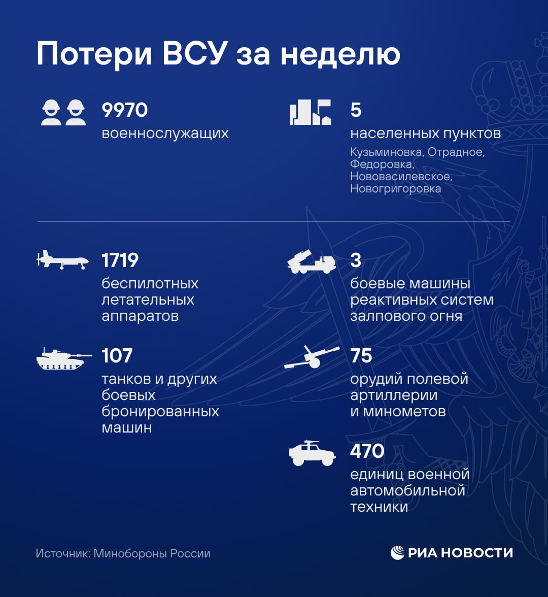 ▪️Группа «Север» освободила населенный пункт Отрадное Харьковской области и нанесла поражение формированиям четырех механизированных бригад ВСУ. Потери противника составили более 1355 военнослужащих, уничтожены две пусковые установки HIMARS.
