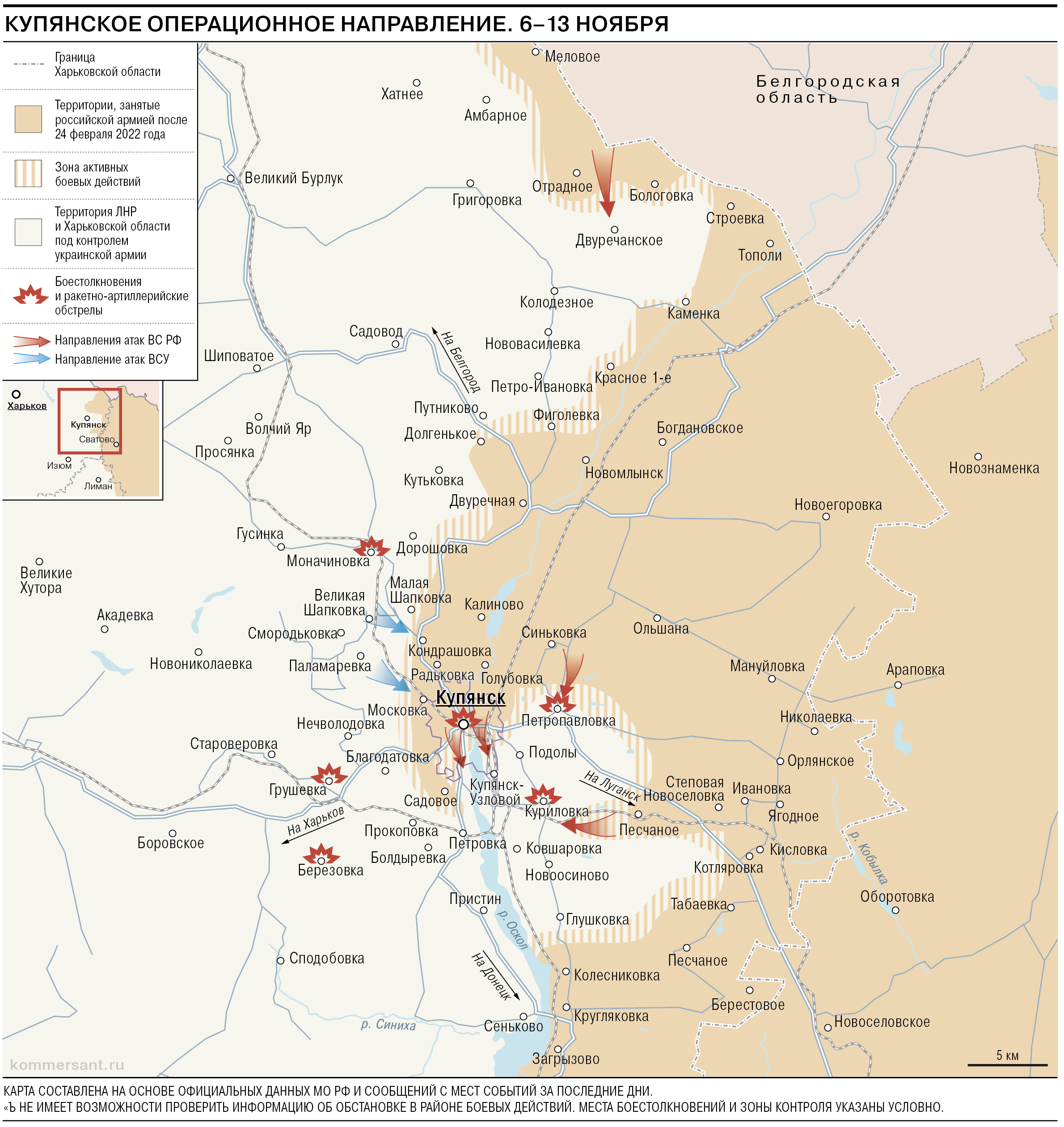 Российские войска, заняв северные районы Купянска, ведут бои в южной части города на обоих берегах реки Оскол. Восточнее продолжаются атаки ВС РФ на Петропавловку и Куриловку