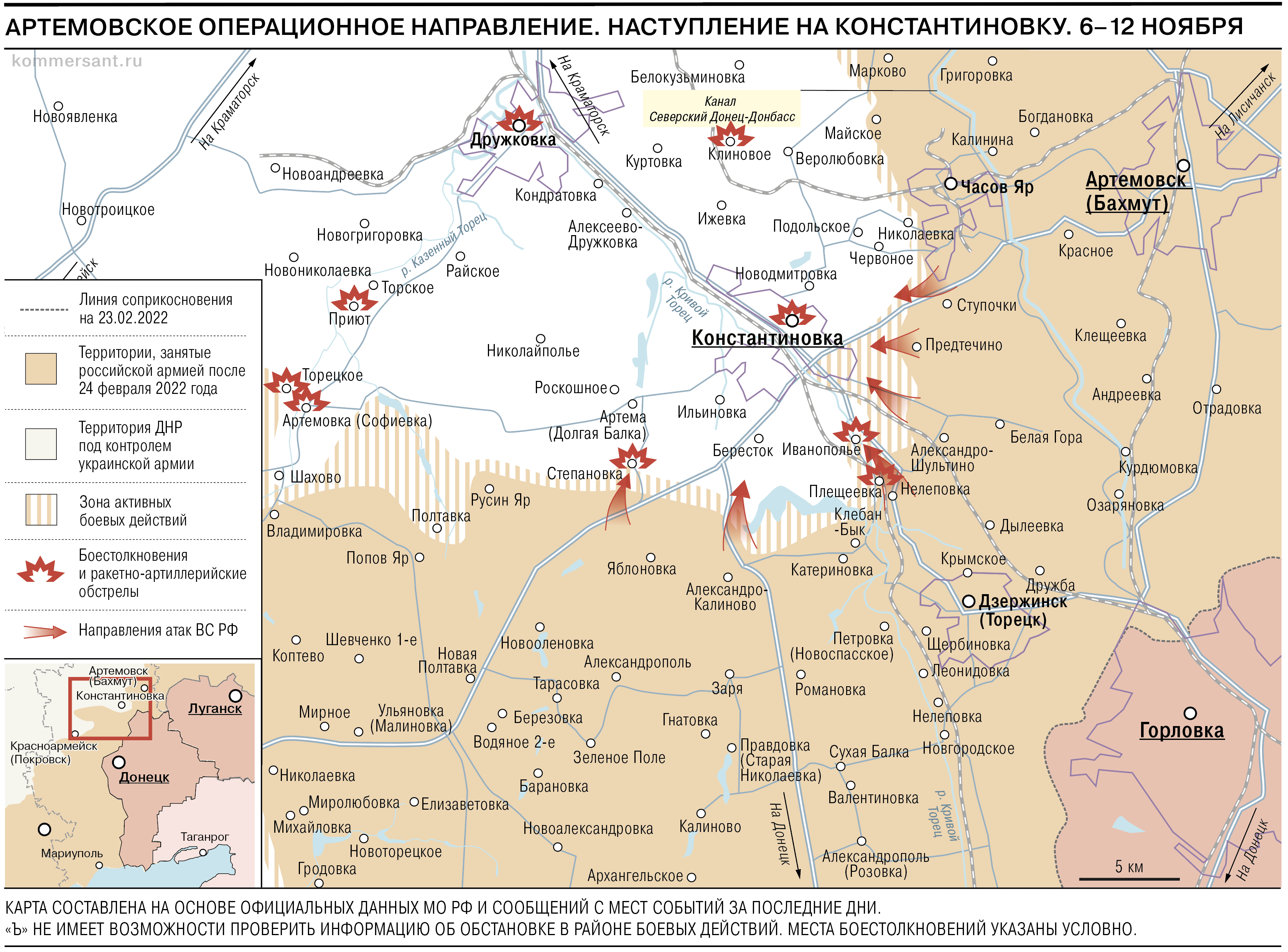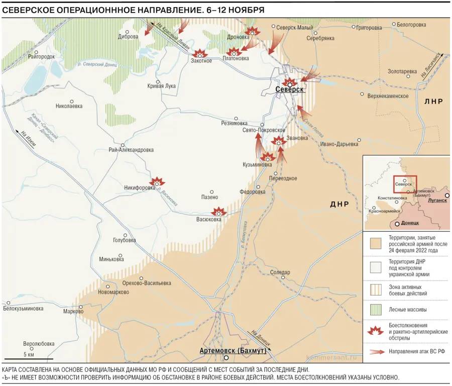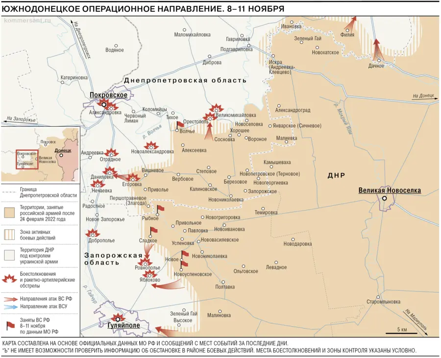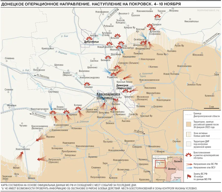 Российские войска атакуют позиции ВСУ в северной части Красноармейска, отражая контратаки со стороны Гришино, а также продвигаются в Димитров с востока. 10 ноября Минобороны сообщило о занятии населенного пункта Гнатовка