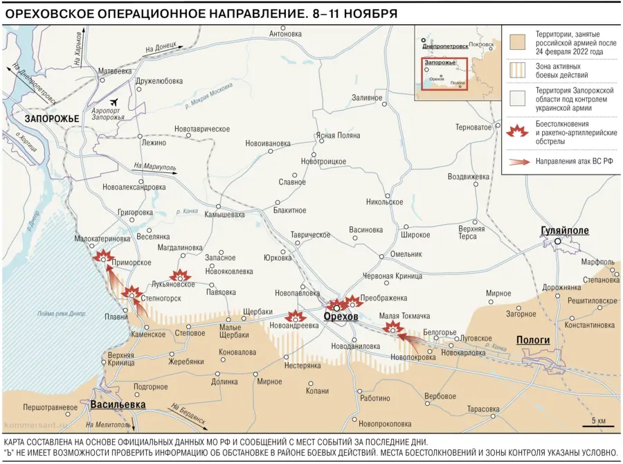 Кроме того, он рассказал о продвижении российских подразделений на западе и востоке поселка Степногорск, ведении российскими военными боев в селе Приморском, а также под Новоданиловкой и Малой Токмачкой.