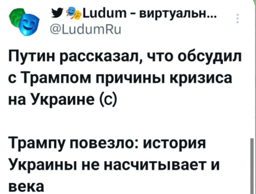 | Саня | Дата: Воскресенье, 13 Июля 2025, 11:39:26 | Сообщение # 3537 |  |     Группа: Админ Сообщений: 65535 Статус: Отсутствует | РИА Новости РОССИИ СТАЛО ЯСНО, ЧТО С НЕЙ НЕ БУДУТ СЧИТАТЬСЯ, ПОКА ОНА НЕ ЗАЯВИТ О СЕБЕ КАК О СУВЕРЕННОЙ ДЕРЖАВЕ, СПОСОБНОЙ ОТСТАИВАТЬ СВОЕ БУДУЩЕЕ - ПУТИН