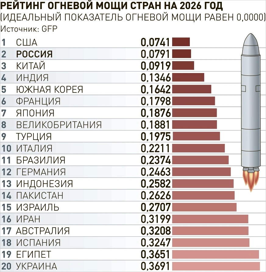 Аналитический ресурс Global Firepower обновил рейтинг военной мощи стран. Россия, как и год назад, заняла второе место. Первенство среди 145 государств осталось за США, на третьем месте расположился Китай. В пятерку лидеров вошли Индия и Южная Корея, в десятку - Франция, Япония, Британия, Турция и Италия. Украина оказалась на 20-м месте, опустившись за год на 2 позиции.