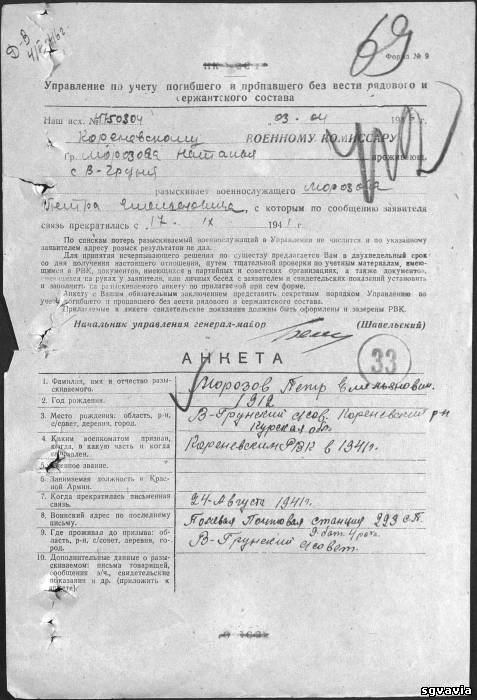 По нему в ОБД не нашел других документов. Ни о розыске пропавшего без вести, ни подворовых опросов, ни об исключении из состава РККА.