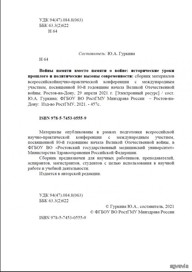 https://elibrary.ru/item.asp?selid=50381017&id=50381006 - 75-ЛЕТИЕ ВЕЛИКОЙ ПОБЕДЫ: ПАМЯТЬ, УРОКИ, ПРОТИВОДЕЙСТВИЕ ФАЛЬСИФИКАЦИЯМ. Сборник статей участников международной онлайн-конференции, посвященной празднованию 75-й годовщины Победы в Великой Отечественной войне 1941-1945 гг.