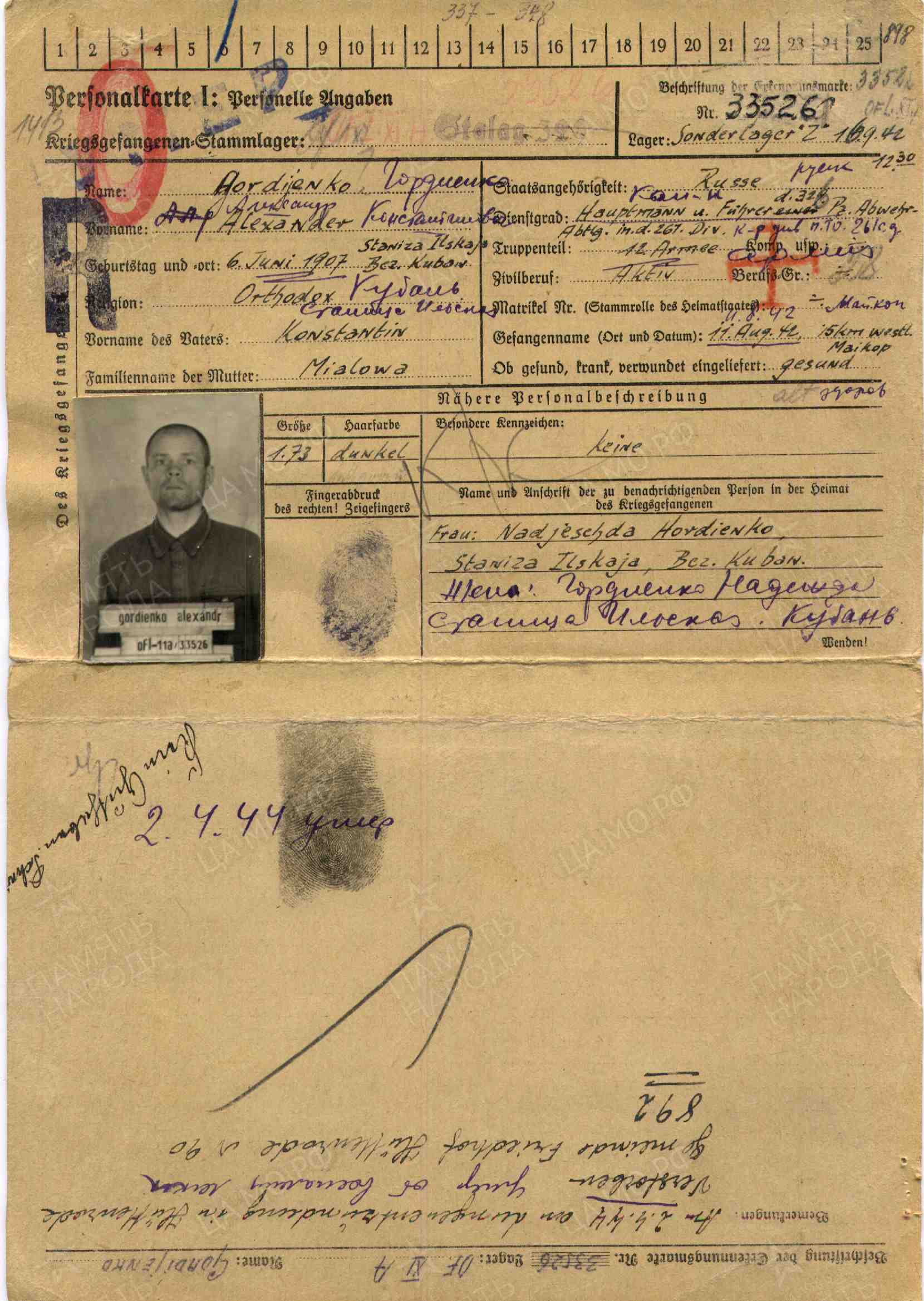 Информация о военнопленном ID 272090728 Фамилия Гордиенко Имя Александр Отчество Константинович Дата рождения/Возраст 06.06.1907 Место рождения Кубань, станица Ильская Дата пленения 11.08.1942 Место пленения Майкоп Лагерь офлаг XI A Лагерный номер 33526 Судьба погиб в плену Последнее место службы 261 сд Воинское звание капитан Дата смерти 02.04.1944 Название источника донесения ЦАМО Номер фонда источника информации Картотека военнопленных офицеров