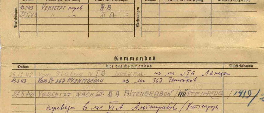 Номер записи 300833840 Фамилия Панченков Имя Тимофей Отчество Кузьмич Дата рождения __.__.1909 Воинское звание солдат (рядовой) Лагерный номер 8337 Дата пленения 03.10.1941 Место пленения Десна Лагерь шталаг 324 Судьба Погиб в плену Дата смерти 05.06.1942 Место захоронения Летцен Название источника информации ЦАМО Номер фонда источника информации 58 Номер описи источника информации 977521 Номер дела источника информации 2136 http://obd-memorial.ru/Image2....46ffa10