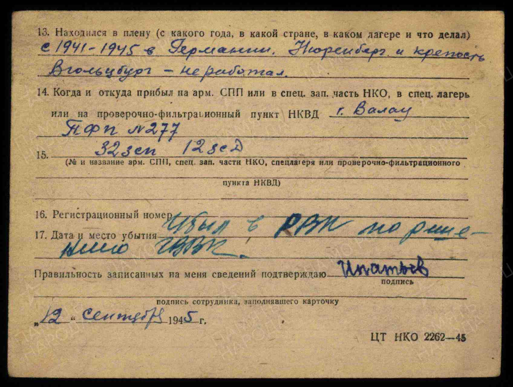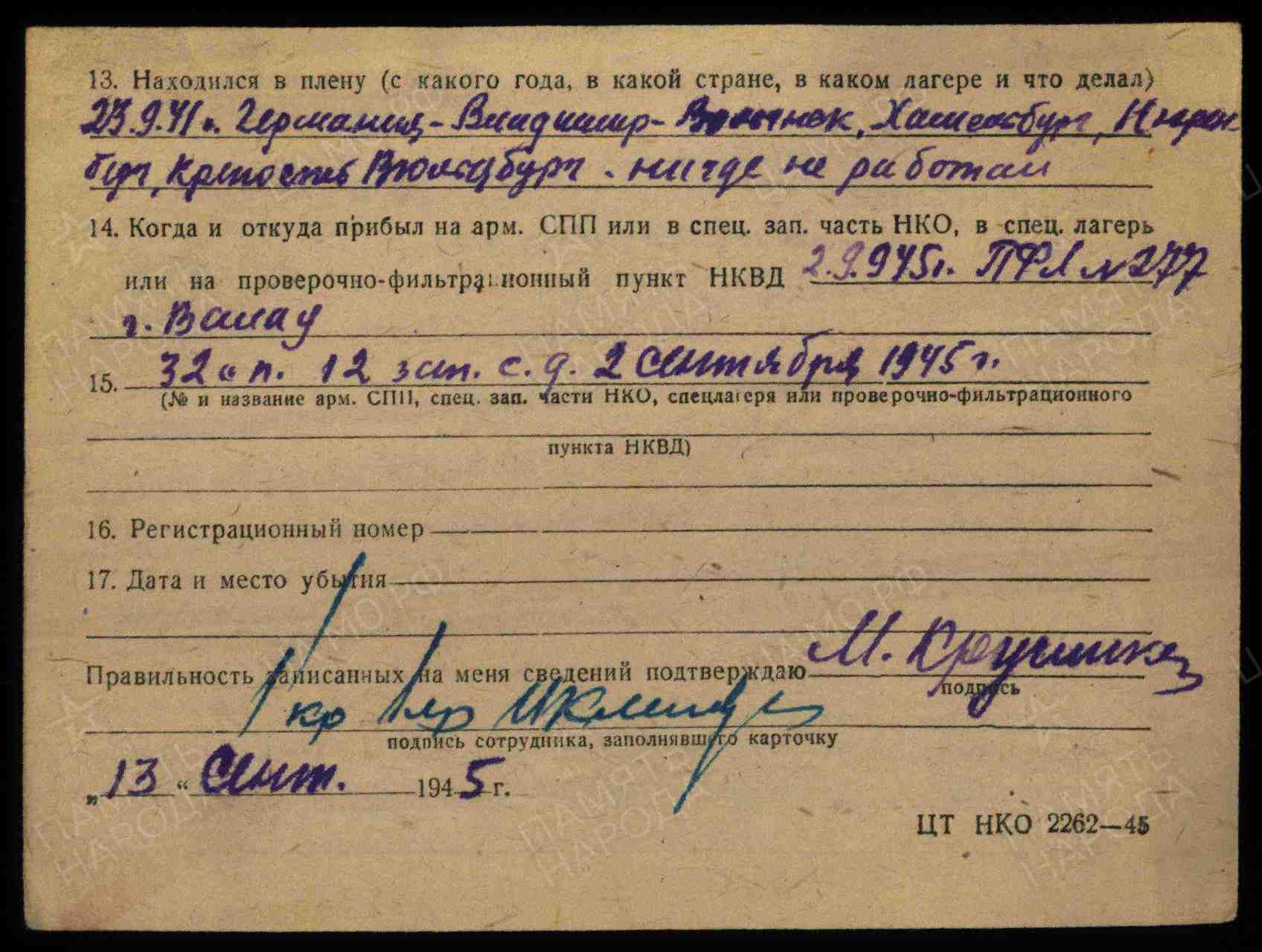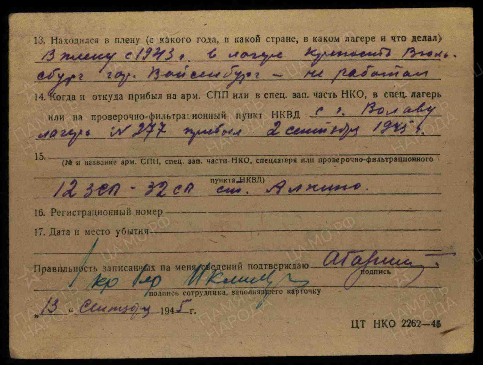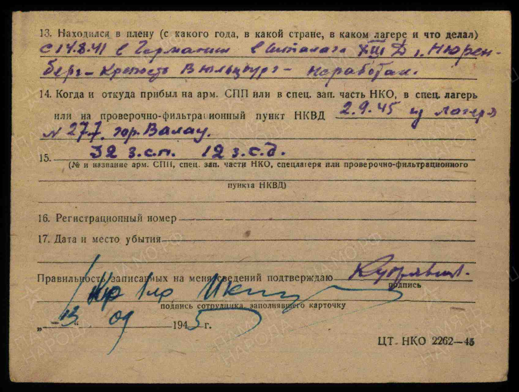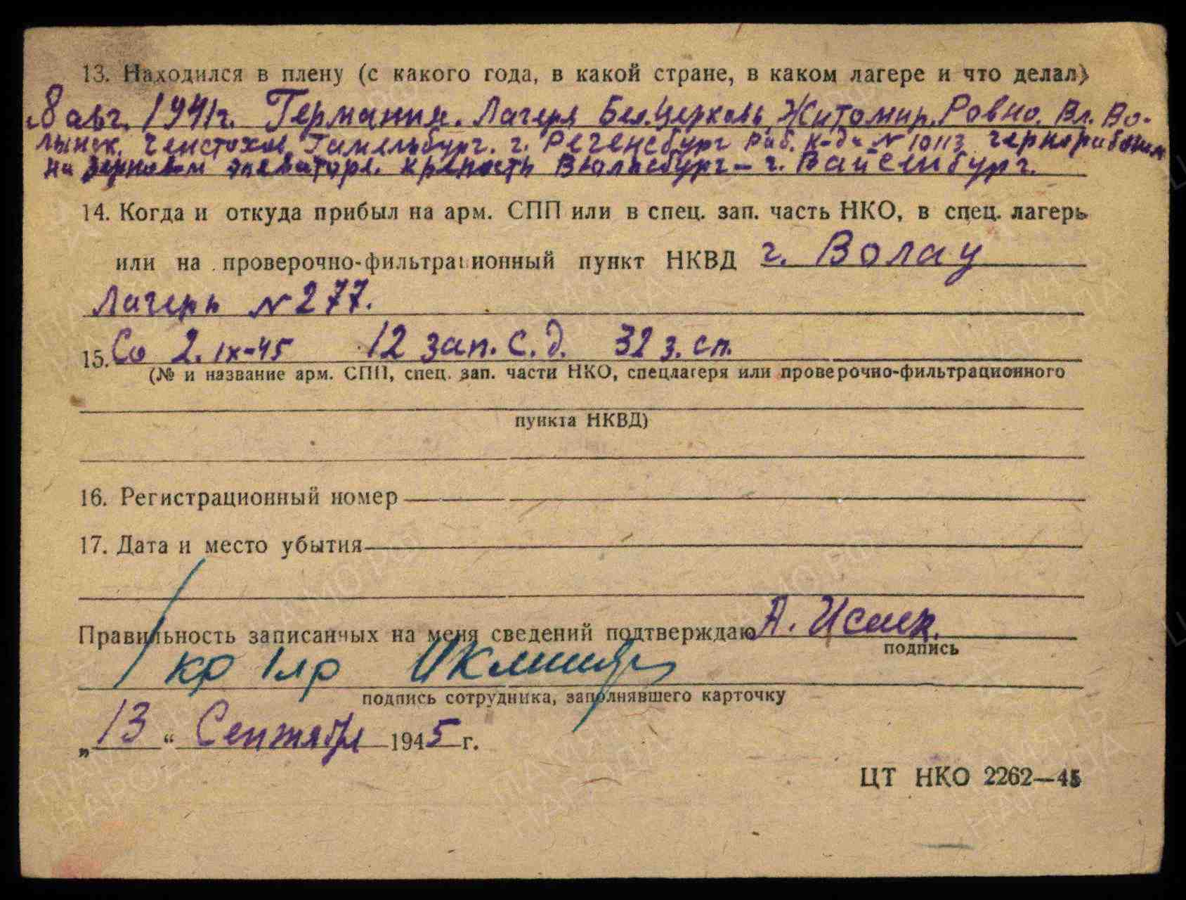 https://obd-memorial.ru/html/info.htm?id=272037408 в карточке из вспомогательной картотеки ВАСта: по Списку (донесению) из илага XIII, прибыл в илаг XIII из офлага XIII D Нюрнберг-Лангвассер 6.09.1943