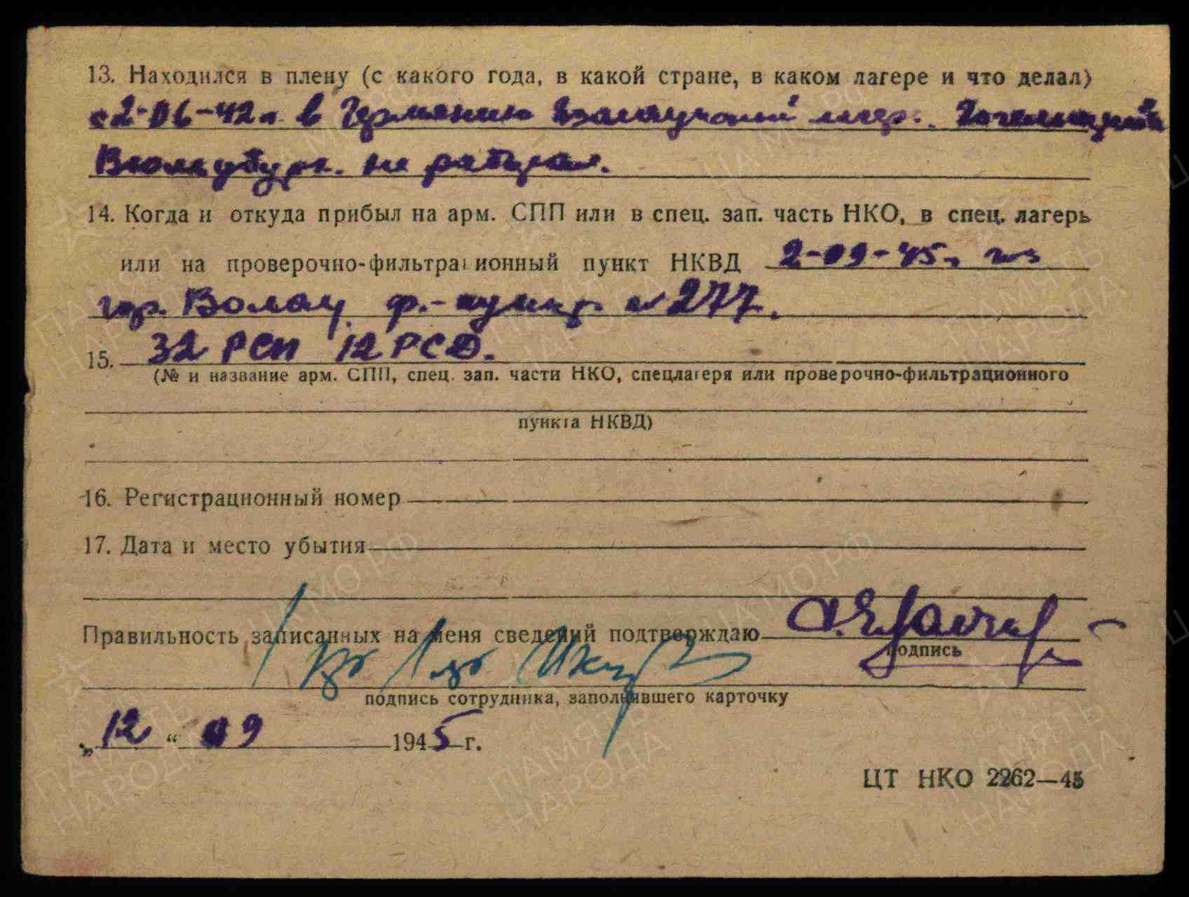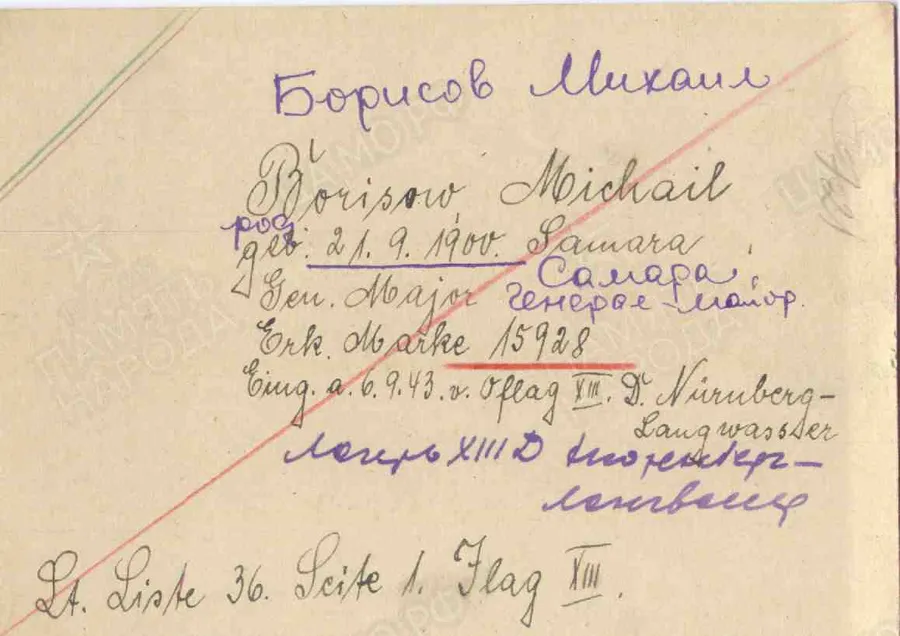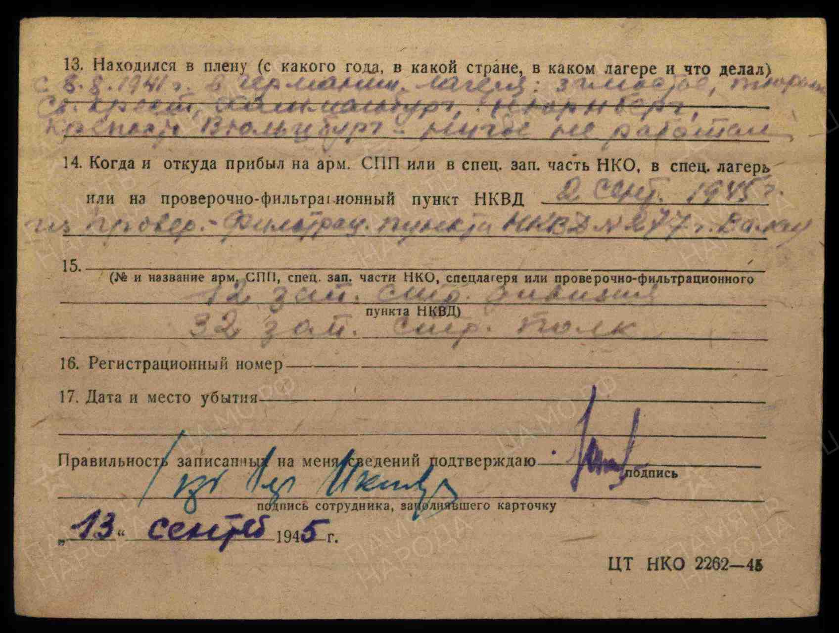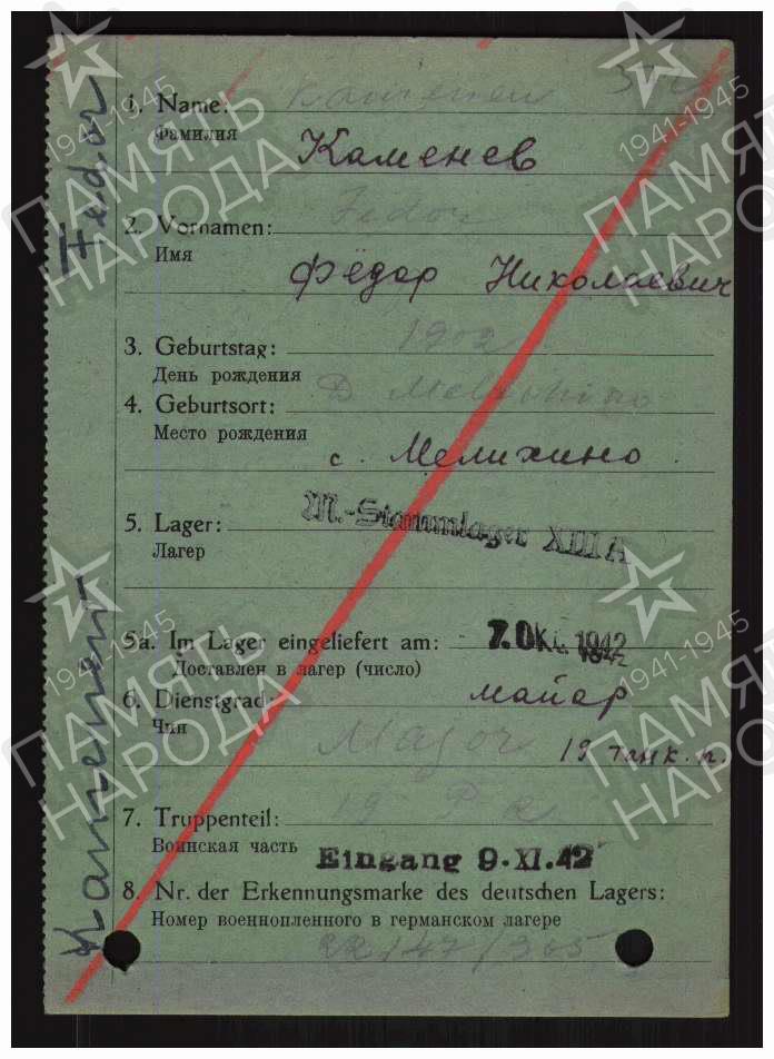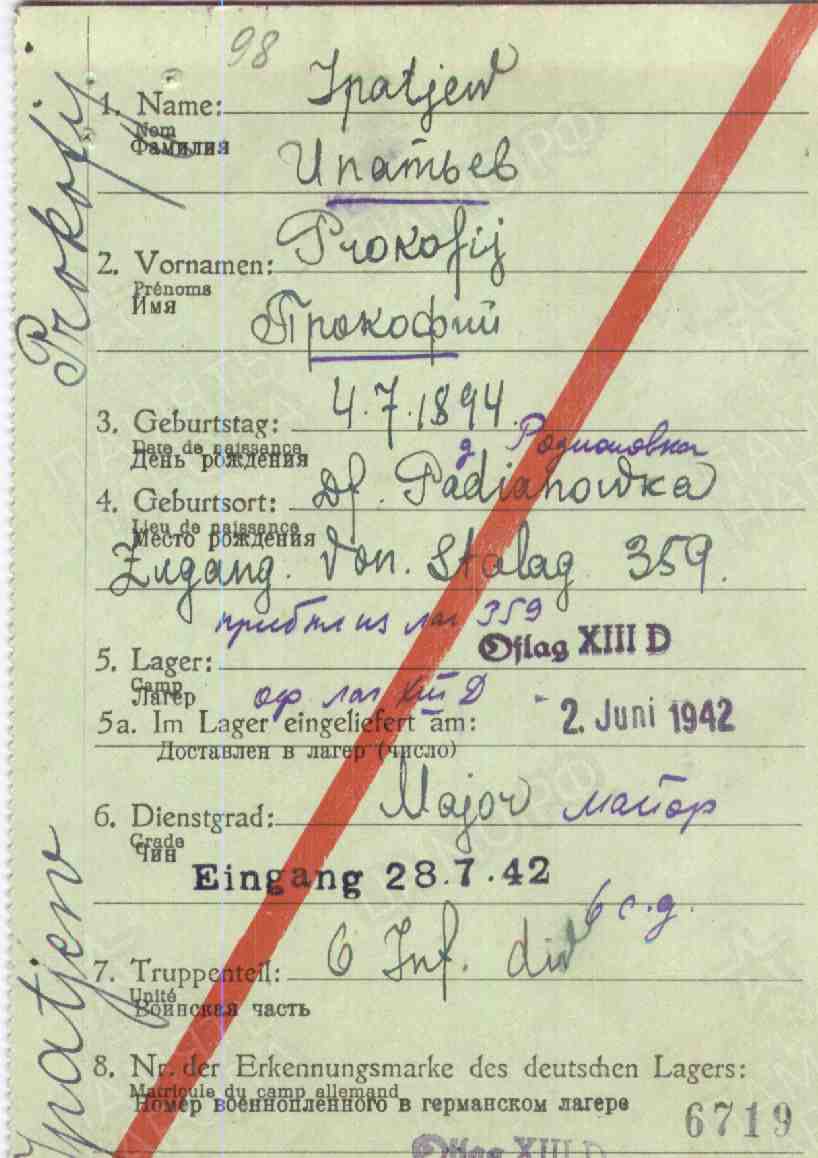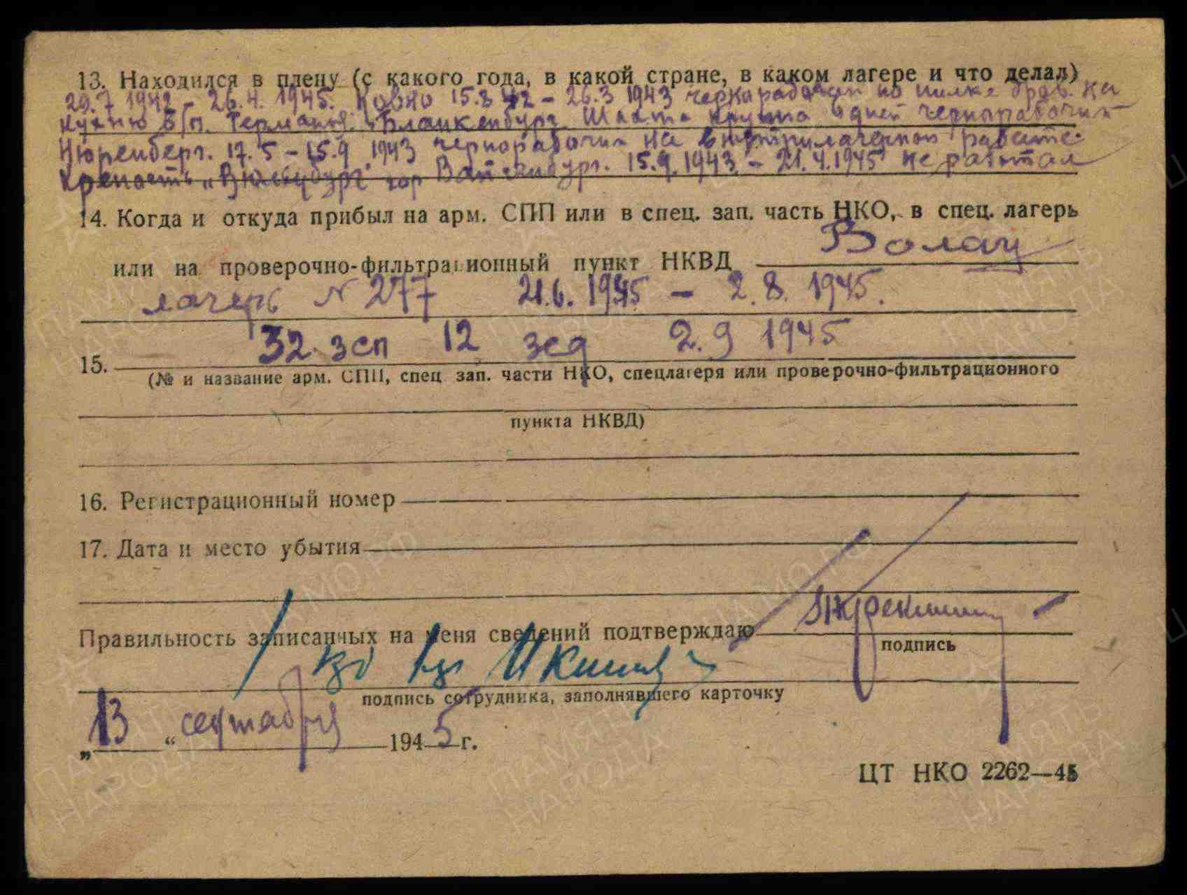 https://obd-memorial.ru/html/info.htm?id=272037408 в карточке из вспомогательной картотеки ВАСта: по Списку (донесению) из илага XIII, прибыл в илаг XIII из офлага XIII D Нюрнберг-Лангвассер 6.09.1943