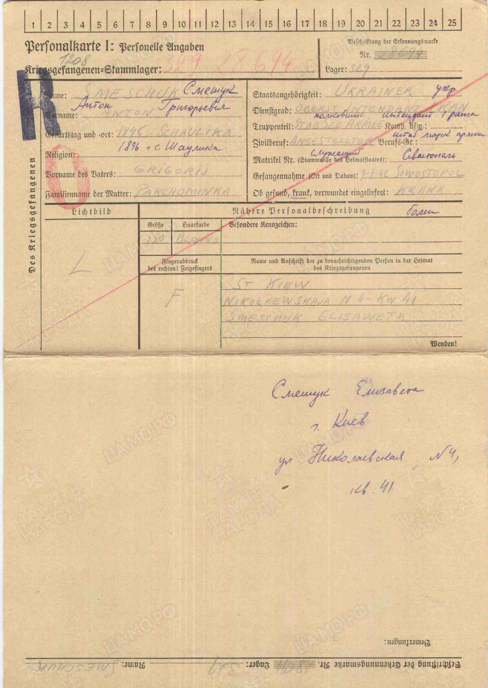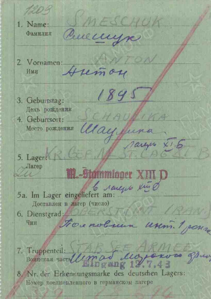 Фамилия Смещук Имя Антон ОтчествоГригорьевич Дата рождения/Возраст__.__.1896 Место рождения Украинская ССР, Киевская обл., Тальновский р-н, с. Шауриха Дата и место призыва __.__.1917 Последнее место службы штаб ПА Воинское звание бывш. полковник инт. сл. Название ВПП/ЗП 7 зсп 1 зсд