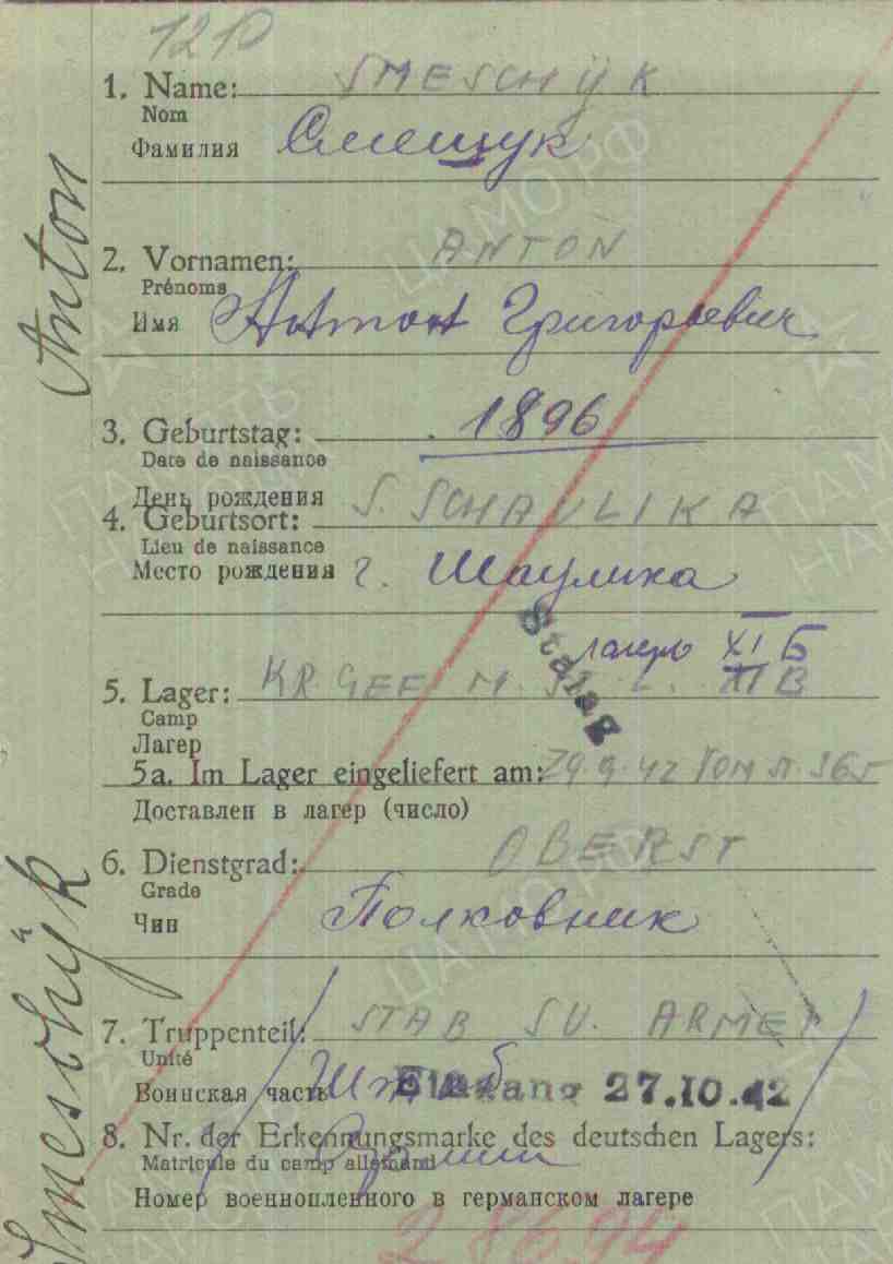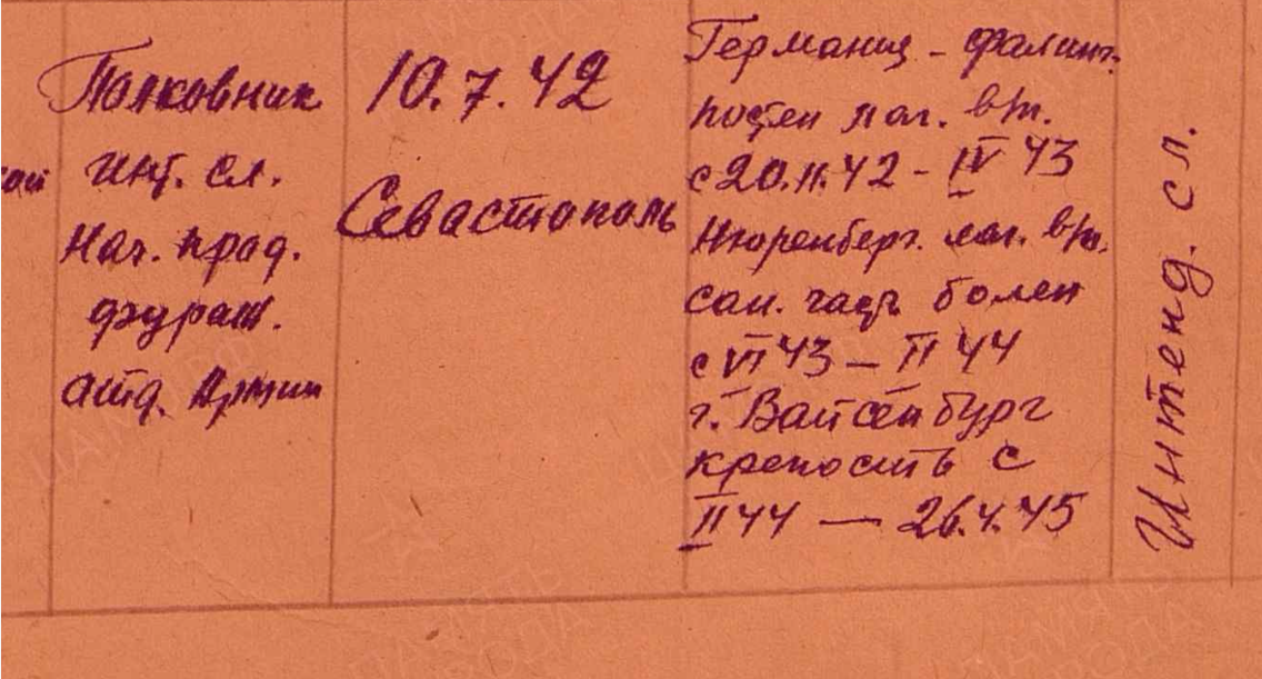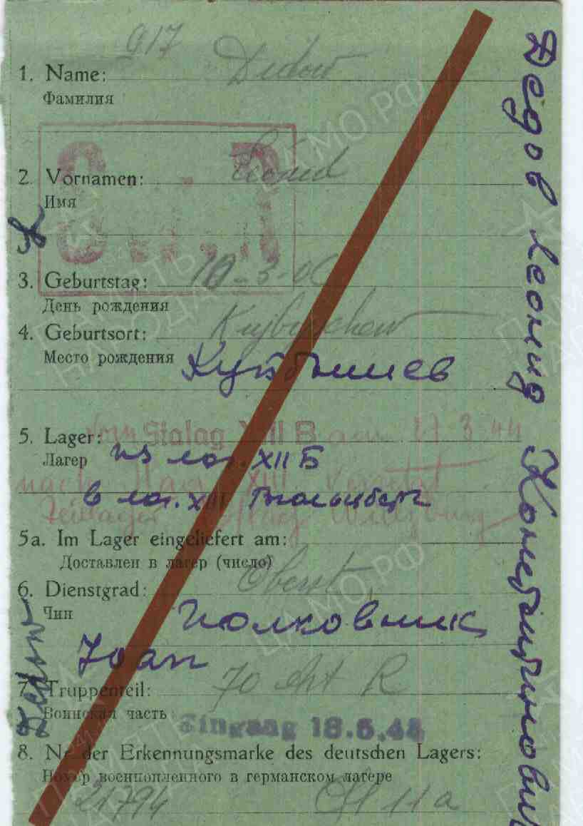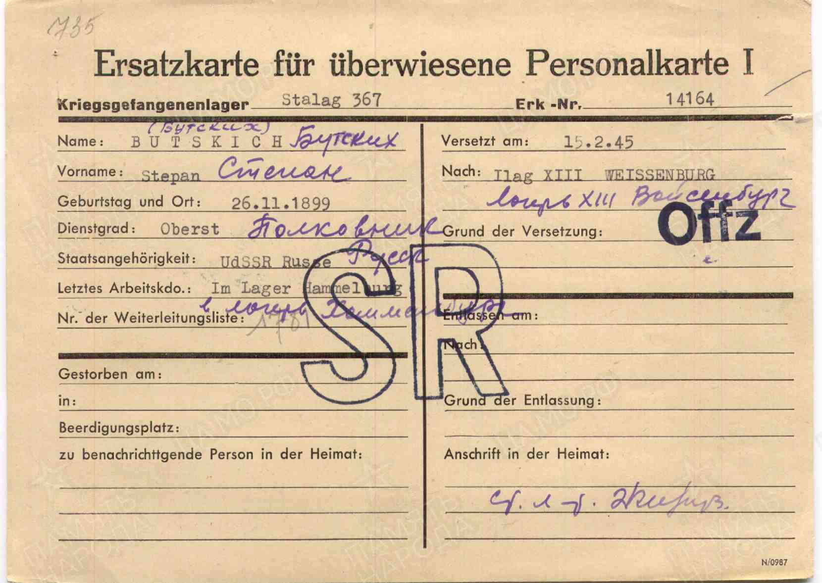 Цитата Сергей1968 (  ) Данных на командира 10 ККД полковника Шевчука Сергея Анисимовича, пропавшего без вести под Одессой 10 апреля 1944 года, по плену и его номера 158241 в ОБД нет, и не указан номер лагеря его присвоивший. Но очень вероятно это был шталаг XVII A, так как есть документ на последнего плененного в ВОВ генерала Любовцева И.М. командира 51 СК второго Укр. фронта. плененного в августе 1944 года в Румынии. Он тоже был в этой крепости Вюльцбург у города Вайсенбург.
