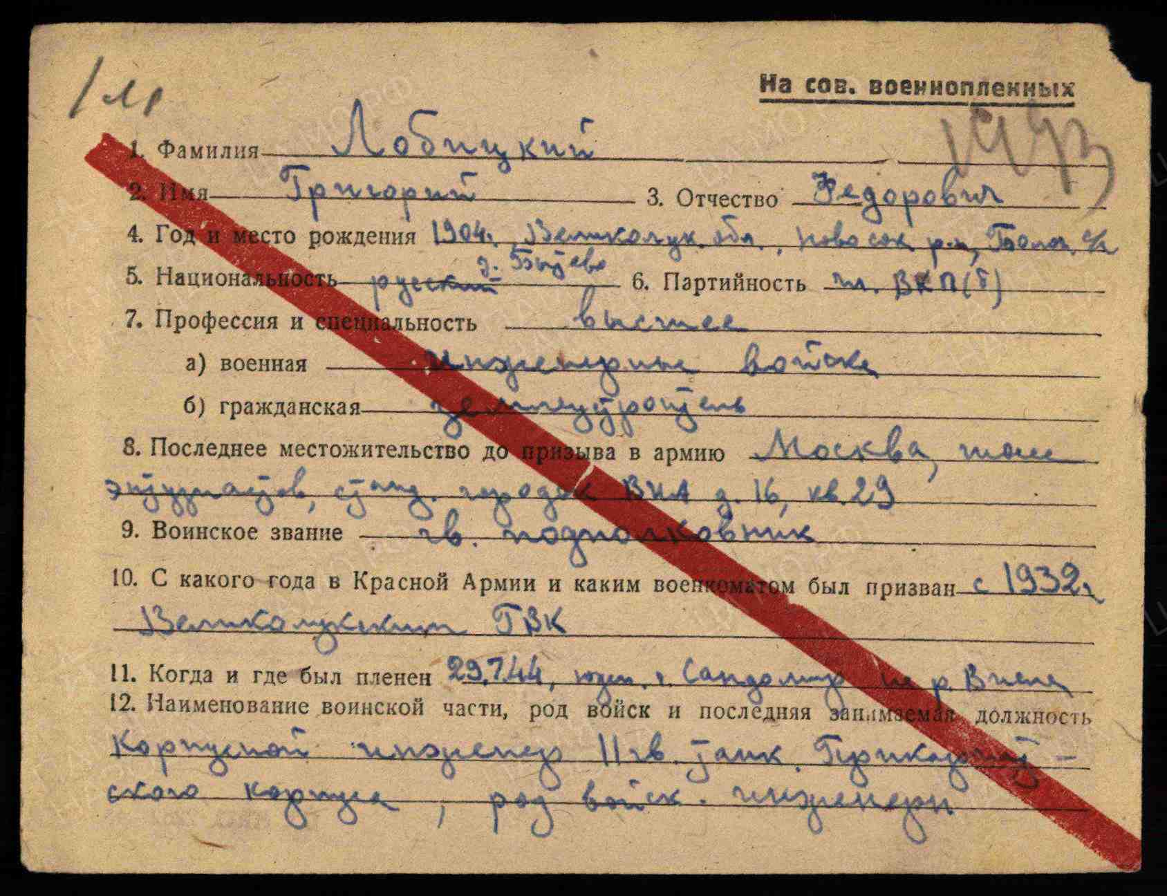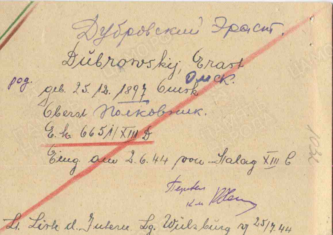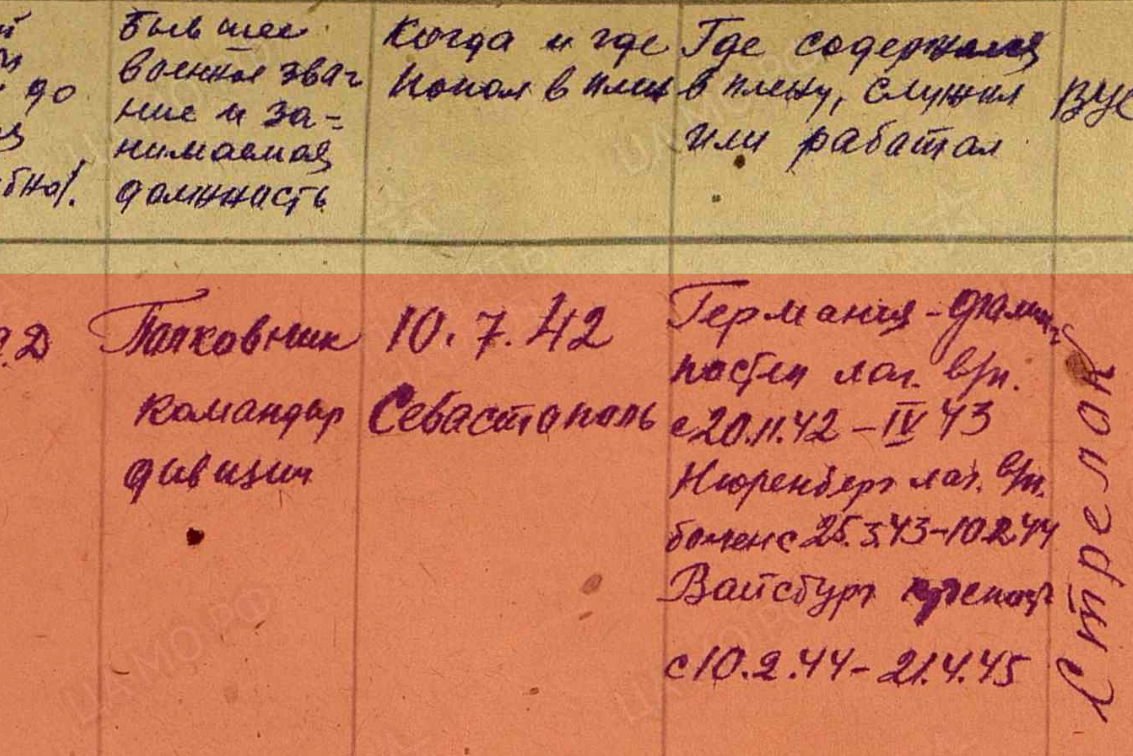 Цитата Сергей1968 (  ) Данных на командира 10 ККД полковника Шевчука Сергея Анисимовича, пропавшего без вести под Одессой 10 апреля 1944 года, по плену и его номера 158241 в ОБД нет, и не указан номер лагеря его присвоивший. Но очень вероятно это был шталаг XVII A, так как есть документ на последнего плененного в ВОВ генерала Любовцева И.М. командира 51 СК второго Укр. фронта. плененного в августе 1944 года в Румынии. Он тоже был в этой крепости Вюльцбург у города Вайсенбург.