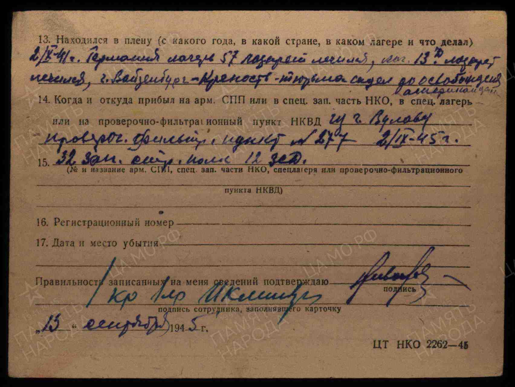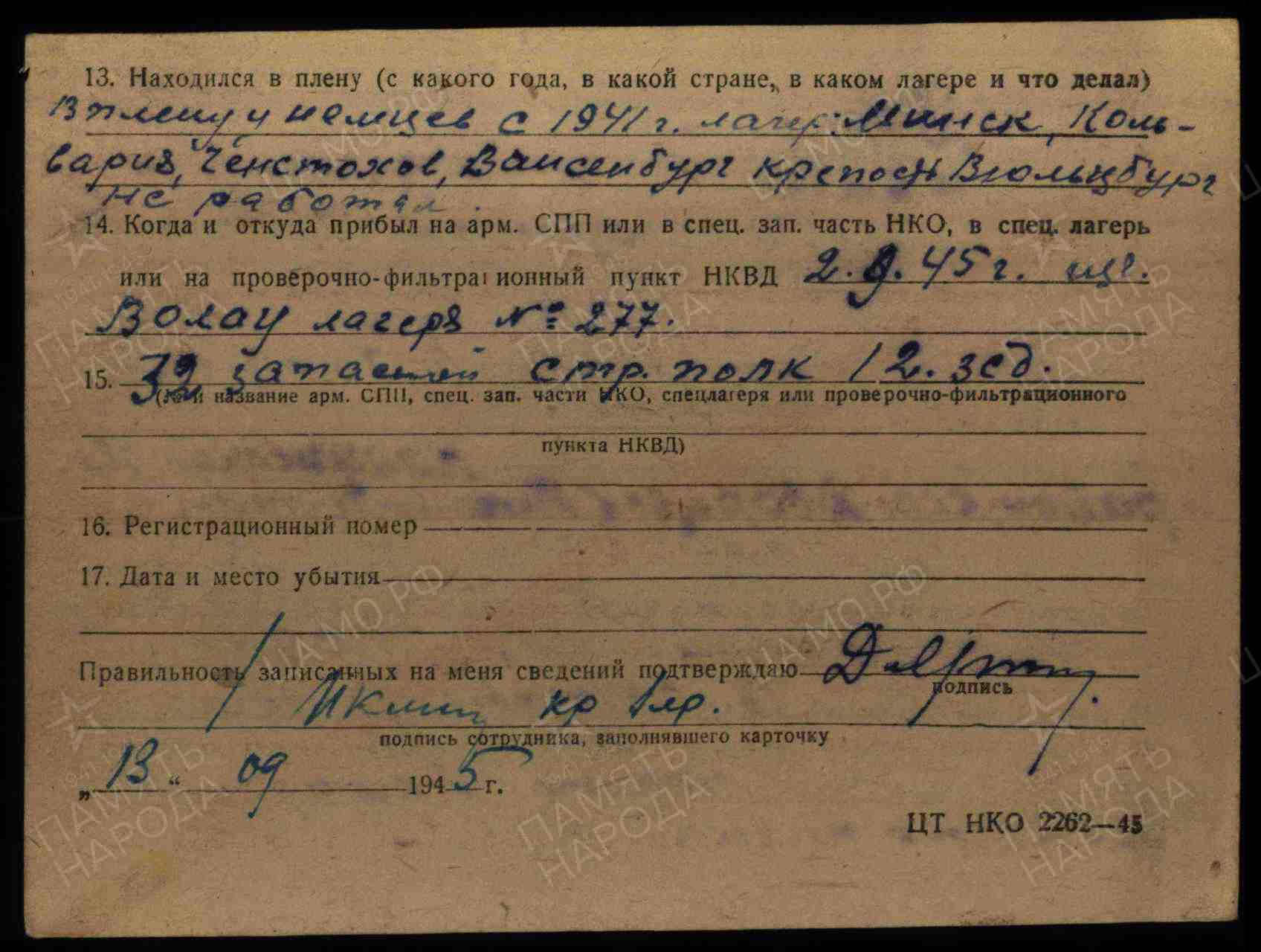 | Интересный пример. Полковник точно в крепости Вюльцбург сидел. Жив и ПК сохранилась. А в ПК о Илаге 13 ни слова. И с датами чехарда в ПК и со слов полковника.