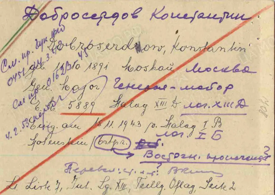 | В карточке на Добросердова (карточка из вспомогательной картотеки ВАСта, заполнена в ВАСте) обозначен илаг XIII, Teillager Oflag