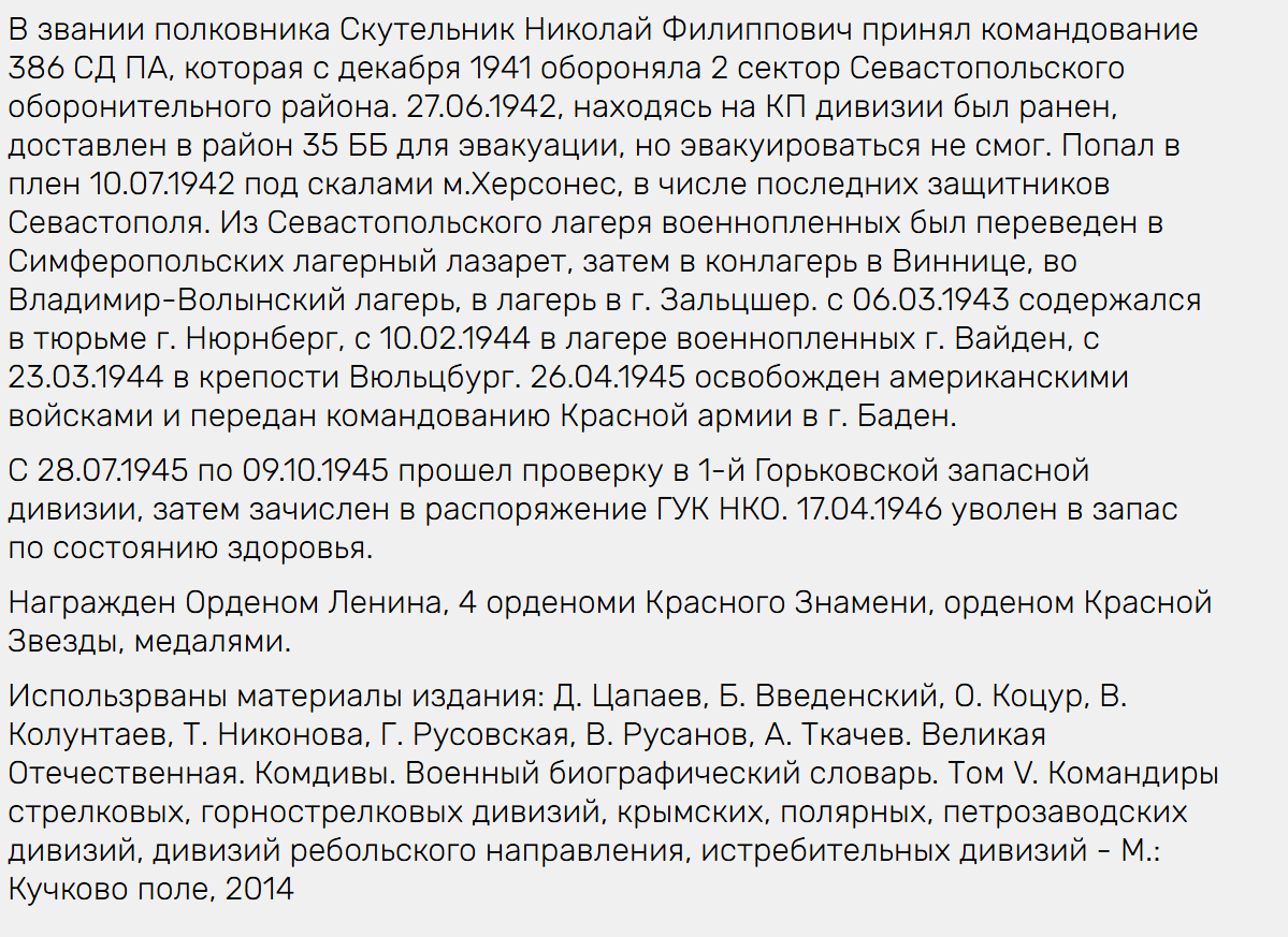 Фамилия Скутельник Имя Николай Отчество Филиппович Дата рождения/Возраст 20.06.1893 Место рождения Бессарабия, Хотинский уезд, м. Секуряны Дата и место призыва 01.03.1919 Место службы 47 гкд; 386 сд Воинское звание полковник Дата выбытия 17.04.1946