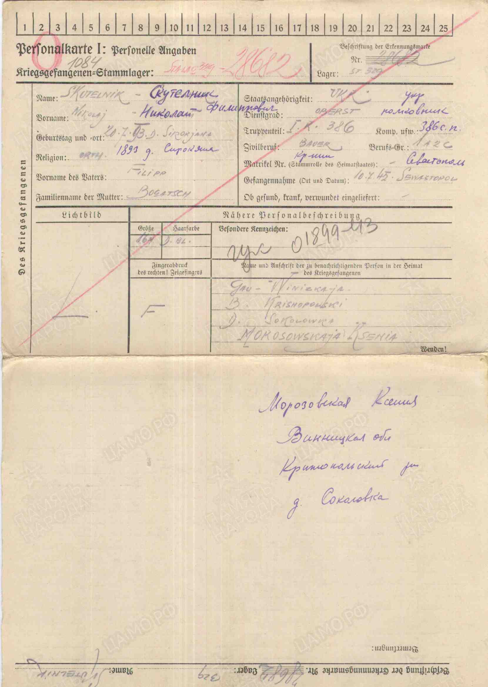 Фамилия Скутелник Имя Николай Отчество Филиппович Дата рождения/Возраст 20.07.1893 Место рождения Сирокяна Дата пленения 10.07.1942 Место пленения Севастополь Лагерь шталаг 329 Лагерный номер 28682 Судьба попал в плен Последнее место службы 386 сп Воинское звание полковник Название источника донесения ЦАМО