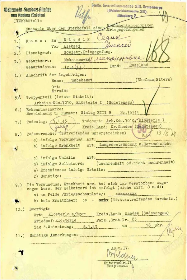 | Авиации СГВ ВОЕННОПЛЕННЫЕ - ШТАЛАГИ, ОФЛАГИ, КОНЦЛАГЕРЯ Лагеря XIII военного округа Германии ( Nürnberg ) Arbeitskommando 7010 , 7005 Meretitz b. Klösterle a. d. Eger (Ustecky Kraj ,Czech Republic) |
