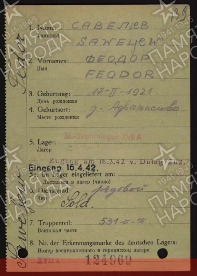 А вот далее у Зойхера перевод после регистрации из шталага XVII A в шталаг XVII B. Ну и далее, видимо, перевод в рабочий лагерь (?) (и уже оттуда в концлагерь) https://obd-memorial.ru/html/info.htm?id=1979214752 Скан этого документа есть в УППЗО Ольга, Новокузнецк Молчат гробницы, мумии и кости, - Лишь слову жизнь дана: Из древней тьмы, на мировом погосте Звучат лишь письмена (И. Бунин)