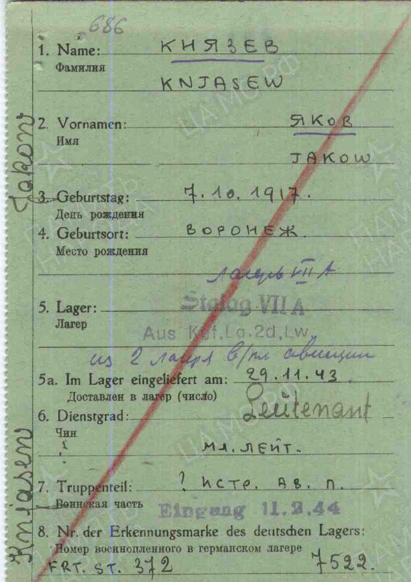 Фамилия Князев Имя Яков Отчество Иванович Дата рождения/Возраст 07.10.1917 Место рождения Воронежская обл., г. Воронеж Дата пленения 21.03.1943 Место пленения Ленинград Лагерь шталаг 372 Лагерный номер 7522 Судьба попал в плен Последнее место службы иап Воинское звание мл. лейтенант Название источника донесения ЦАМО