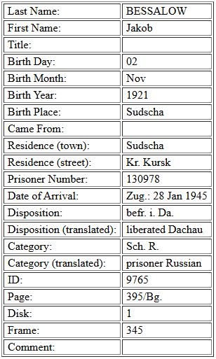 кр-ц пограничник Бессалов Яков Николаевич в плену выжил... скончался 06.12.2001 г. Фамилия Бессалов (Бесалов) Имя Яков Дата рождения/Возраст 02.11.1921 Место рождения Суджа Дата пленения Не позднее 28.01.1945 Лагерь концлагерь Дахау Лагерный номер 138778 Судьба попал в плен Название источника донесения Национальный архив США (NARA) Номер фонда источника информации RG242 Номер описи источника информации A3355 Номер дела источника информации 136 https://obd-memorial.ru/html/info.htm?id=1978034917 Задержан 22.11.1944 в Маннгейме ЗиПо Баден/Эльзас https://collections.arolsen-archives.org/de/document/9981267 Николай Викторович 14 ОА ПВО 1974-1976 У России только два союзника - это Армия и Флот