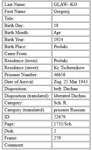 До того, как стать узником концлагеря, он был военнопленным. В гестапо и затем в концлагерь попал за какой-то проступок (попытка побега, или саботаж, или агитация и т.п.). Причëм, не похоже, что в Дахау он попал прямо из шталага 346 Кременчуг (в фильтрационной карточке нередко указывали не всю информацию, а кратко). В Дахау он прибыл из гестапо Карлсруэ, это V округ рейха. Возможно, из шталага 346 был переведён (с этапом пленных) в один из шталагов V округа, а оттуда уже попал в Дахау. Хотя про V округ рейха - это только предположение... передача в конкретное гестапо и в концлагерь не всегда связана с одним округом. Между Кременчугом и Дахау - явный пробел. Попробую посмотреть, если получится, по близким номерам Дахау... Очень бы помогло, если бы Вы могли назвать его товарищей по плену, если что-то сохранилось в записях