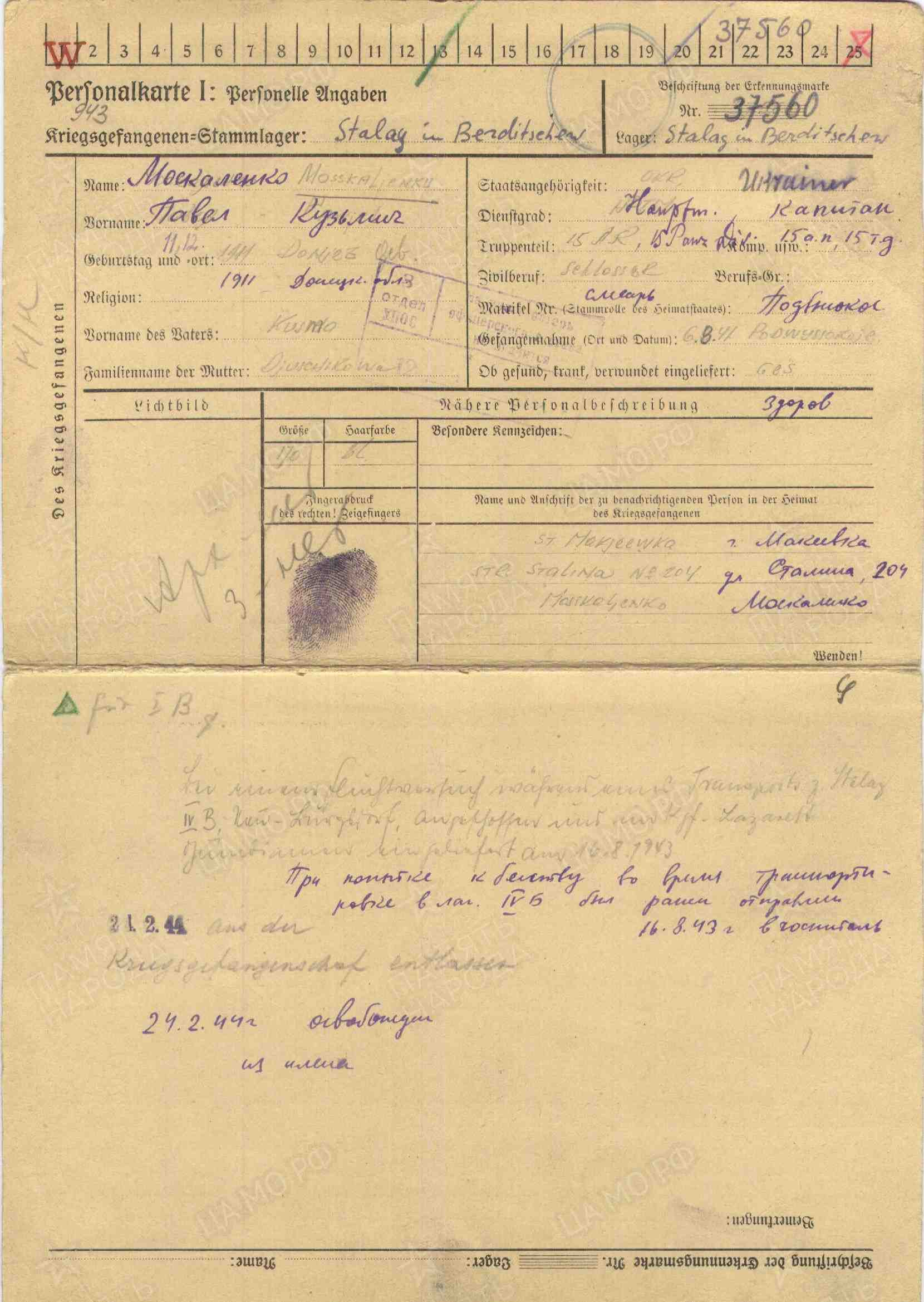 Пятый в списке - Москаленко. Он тоже изменил фамилию в плену. Идентифицировать было сложно. Потратила вечер, но нашла. История в плену у него непростая, судя по ПК-1. Плен пережил. 1958 г. медаль "За отвагу" (образ наградного, к сожалению, пока не выложен).