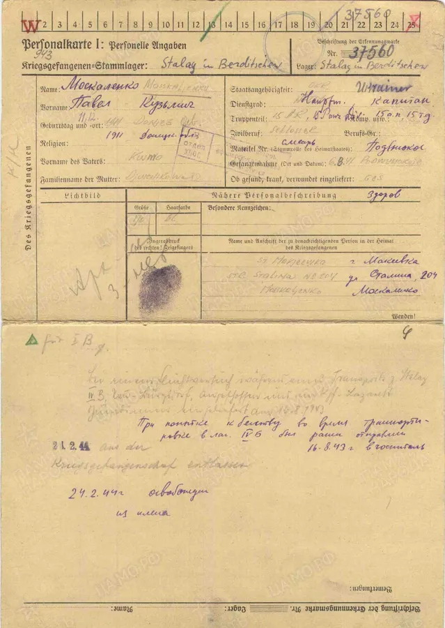 И только 21.05.1943 !!! - на него оформляют карту военнопленного, привезя его во Владимир-Волынск из лагеря в Бердичеве. На тот момент лагерь в Бердичеве - это цвайгларерь шталага 339 Киев-Дарница, до апреля 1943 это цвайгларерь шталага 358 Житомир (Богуния) https://muse.jhu.edu/document/4642