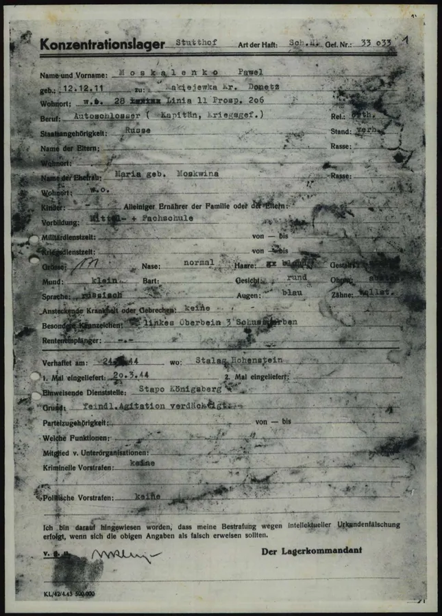 (После выздоровления) 9.12.1943 попадает практически там же в "лагерь ожидания" Гëркен (предлагерь шталага I A), а 17.12.1943 переведëн в шталаг I B Хоэнштайн. Что закономерно для провинившегося. Далее в феврале 1944 отпущен из плена и отправлен в концлагерь Штуттгоф. В карте узника провинность записана как вражеская агитация.