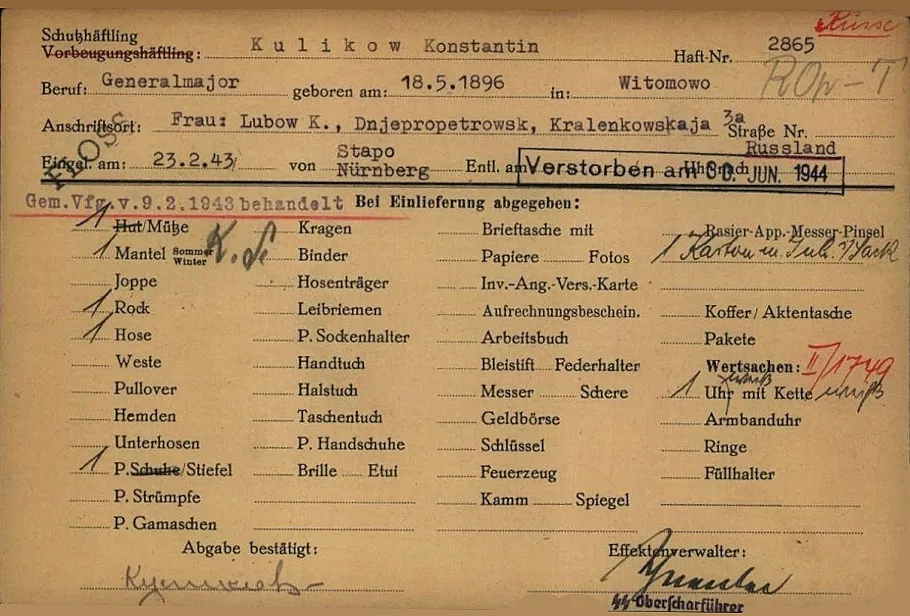 Фамилия Куликов Имя Константин Отчество Ефимович Дата рождения/Возраст 18.05.1896 Место рождения Витомово Дата пленения 21.09.1941 Место пленения Засоновка Лагерь офлаг XI A Лагерный номер 2108 Судьба передан гестапо/СД — 12.02.1943 Последнее место службы 196 див. штаб Воинское звание генерал Название источника донесения ЦАМО Номер фонда источника информации Картотека военнопленных офицеров https://obd-memorial.ru/html/info.htm?id=272064597&p=1