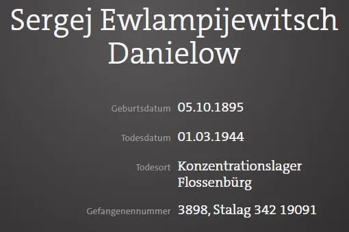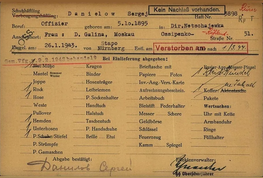 ...В конце февраля 1944 года заподозрен в связях с подпольем и по приказу Гиммлера был казнен с особой жестокостью. Данилова до смерти забили палками, и он скончался, не приходя в сознание 1 марта 1944 года. https://ru.wikipedia.org/wiki....8%D1%87
