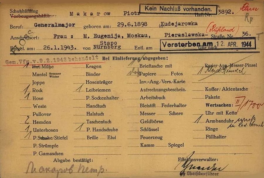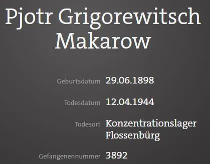 ...Первоначально Макаров содержался в лагере военнопленных в Замостье в оккупированной Польше, затем в концлагере Хаммельбург. В декабре 1942 года Макаров был переведён в концентрационный лагерь Флоссенбюрг, где от побоев и истощения заболел туберкулёзом. Осенью 1943 года убит в лагере. https://ru.wikipedia.org/wiki....5347421