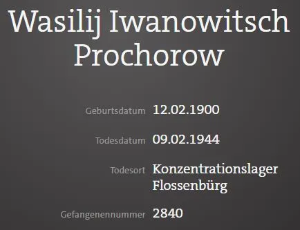 ...Во Флоссенбурге Прохоров ударил капо и убил. Охранники избили его до полусмерти. Затем, истощённый, он был отправлен в ревир, где ему сделали смертельный укол. Оттуда — отправили в крематорий, генерал Михайлов Н. Ф. свидетель гибели генерала Прохорова В. И. https://ru.wikipedia.org/wiki....%D1%80)