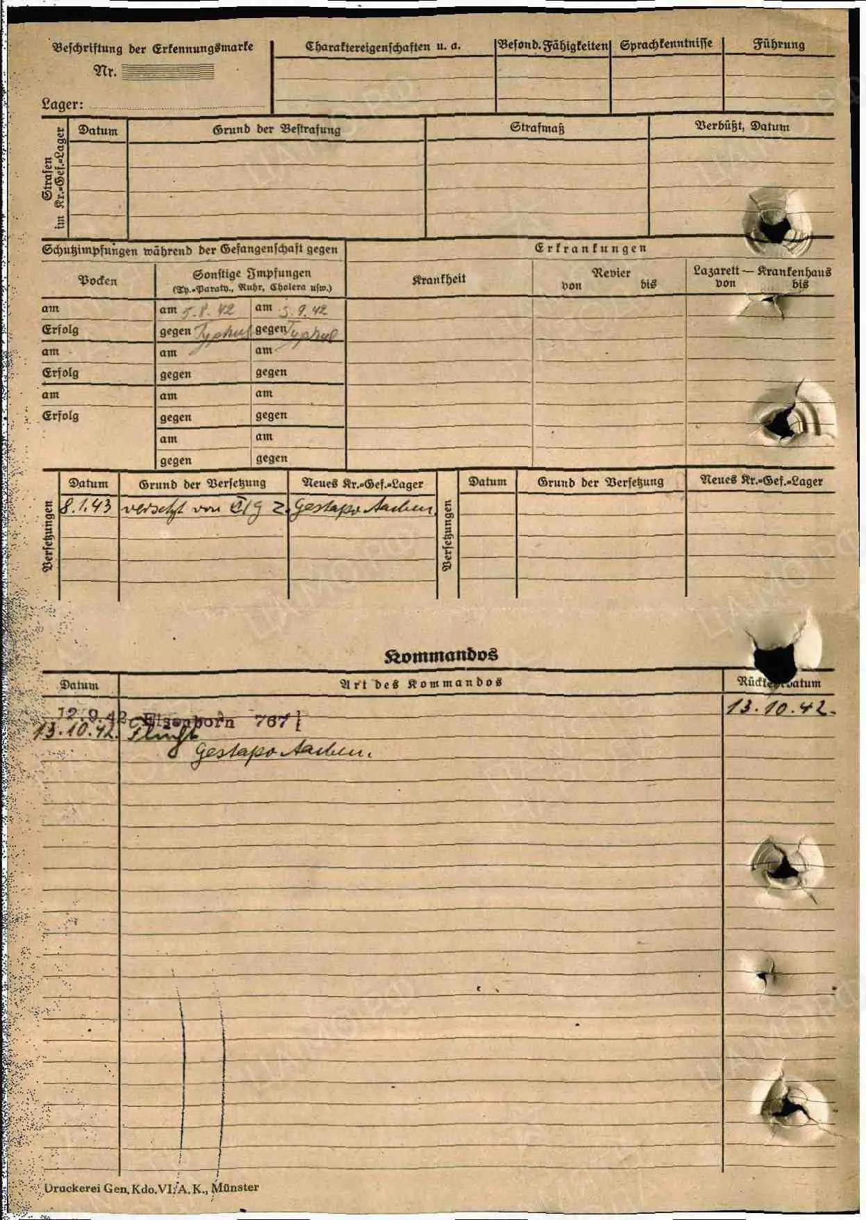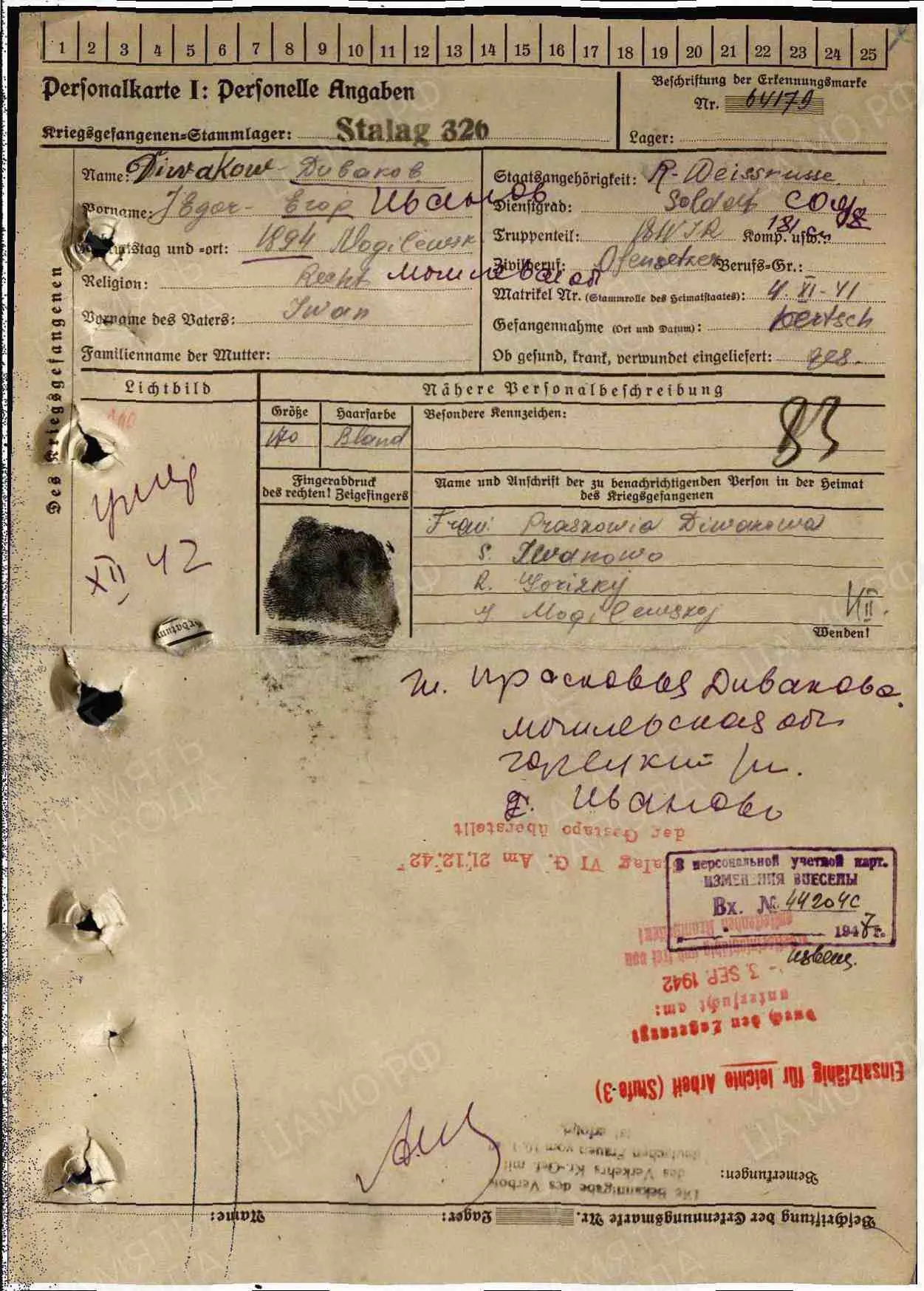 Вот его карта военнопленного, оформленная в VI округе рейха, стандартно в шталаге 326 (VI K):