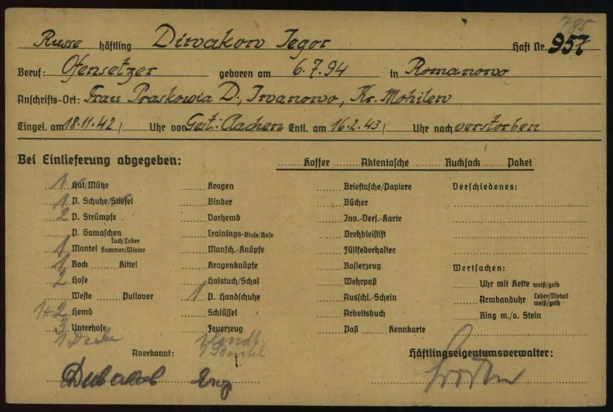Диваков из гестапо Аахен отправлен в концлагерь Нидерхаген, где умер 16.02.1943 (диагноз Слабость сердечной мышцы)