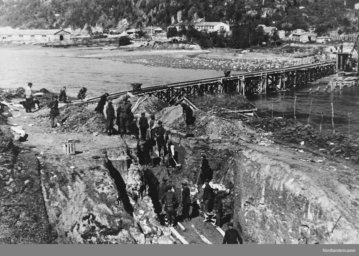 Fangearbeid ved krigsfangeleiren i Kroken. Vi ser fanger som graver en stor grøft/kanal på østsiden av elven. Over elven sees en bro med skinner på. Et par vogner sees på broen. Selve leiren sees såvidt øverst på bildet.