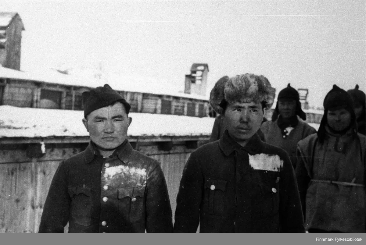 Asiatiske sjømenn fra det britiske transportskipet d/s "Empire Ranger" i den sovjetsiske krigsfangeleiren på Høybuktmoen flyplass. 61 fanger ankom Kirkenes 29. mars 1942 med de tyske jagerne "Z 24" og "Z 25" etter at skipet deres hadde blitt senket dagen før av bombefly fra kampving 30 nord av Murmansk. "Empire Ranger" var en del av den allierte forsyningskonvoien PQ 13.