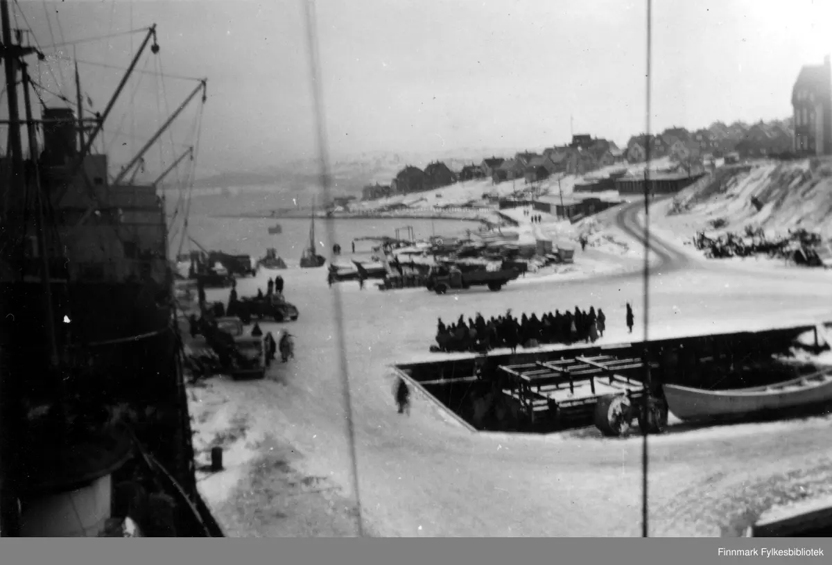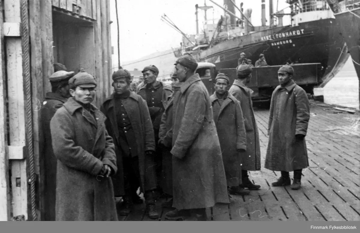 Sovjetiske krigsfanger på kai i Kirkenes i siste halvdel av august - første halvdel av september 1941. I bakgrunnen det tyske transportskipet d/s "Hans Leonhardt" (4174 BRT).