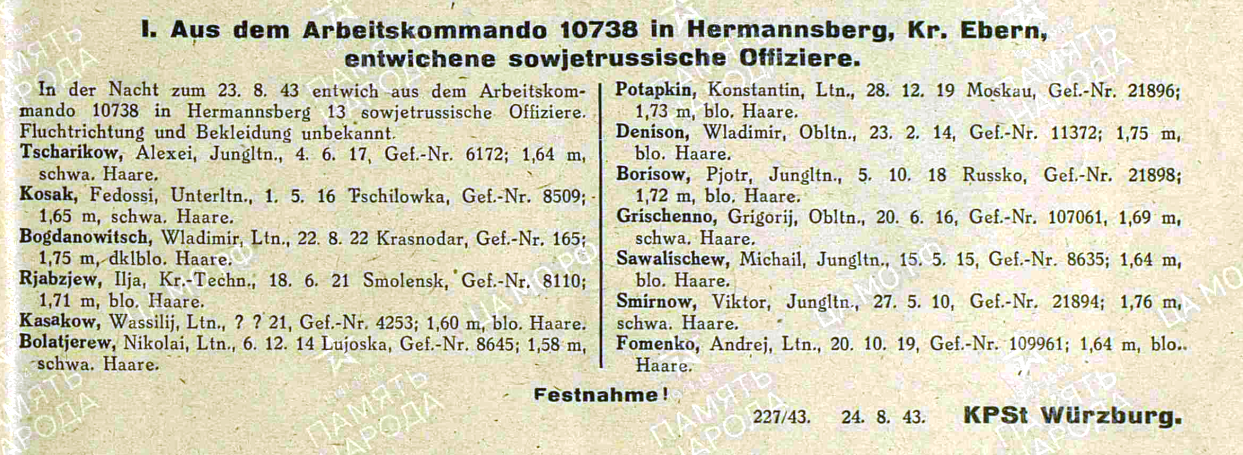 Бежал 15.06.1944 и не был пойман, о чëм доложено в ВАСт 10.10.1944. ВАСт зарегистрировал получение ЗК с такой записью 18.10.1944 https://obd-memorial.ru/html/info.htm?id=272122804&p=3 Ольга, Новокузнецк Молчат гробницы, мумии и кости, - Лишь слову жизнь дана: Из древней тьмы, на мировом погосте Звучат лишь письмена (И. Бунин)