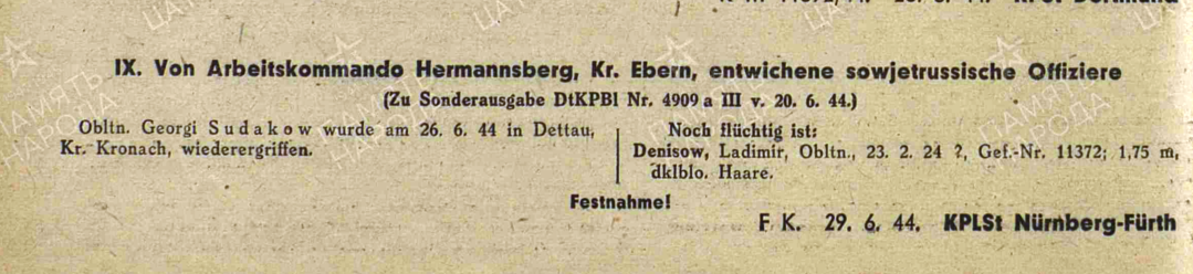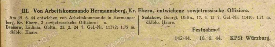 Фамилия Денисов Имя Владимир (Ладиня) Дата рождения/Возраст 23.02.1924 Дата пленения Не позднее 15.06.1944 Лагерный номер 11372 Судьба сбежал из плена Воинское звание ст. лейтенант Название источника донесения РГВА Номер фонда источника информации 500 Номер описи источника информации 4 Номер дела источника информации 361 https://obd-memorial.ru/html/info.htm?id=84872765 Qui quaerit, reperit