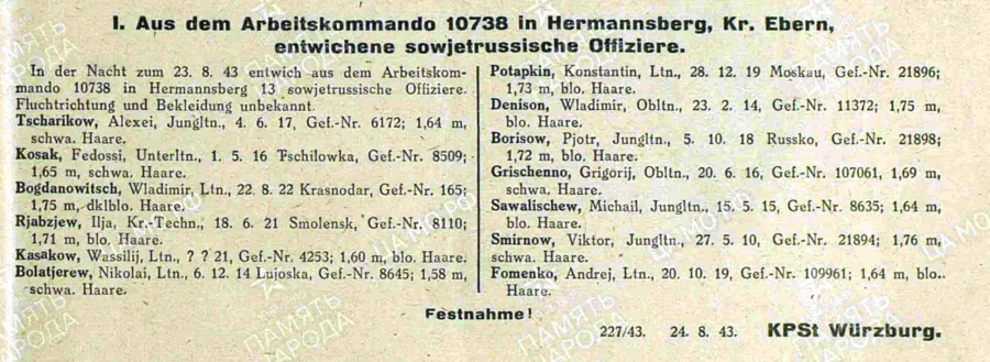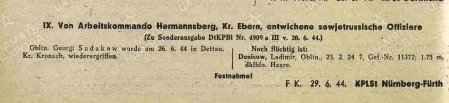 Если бы поймали, то отправили бы в концлагерь. Но по концлагерям они (Денисов и Судаков) не проходят. Домой не вернулись. Ольга, Новокузнецк Молчат гробницы, мумии и кости, - Лишь слову жизнь дана: Из древней тьмы, на мировом погосте Звучат лишь письмена (И. Бунин)