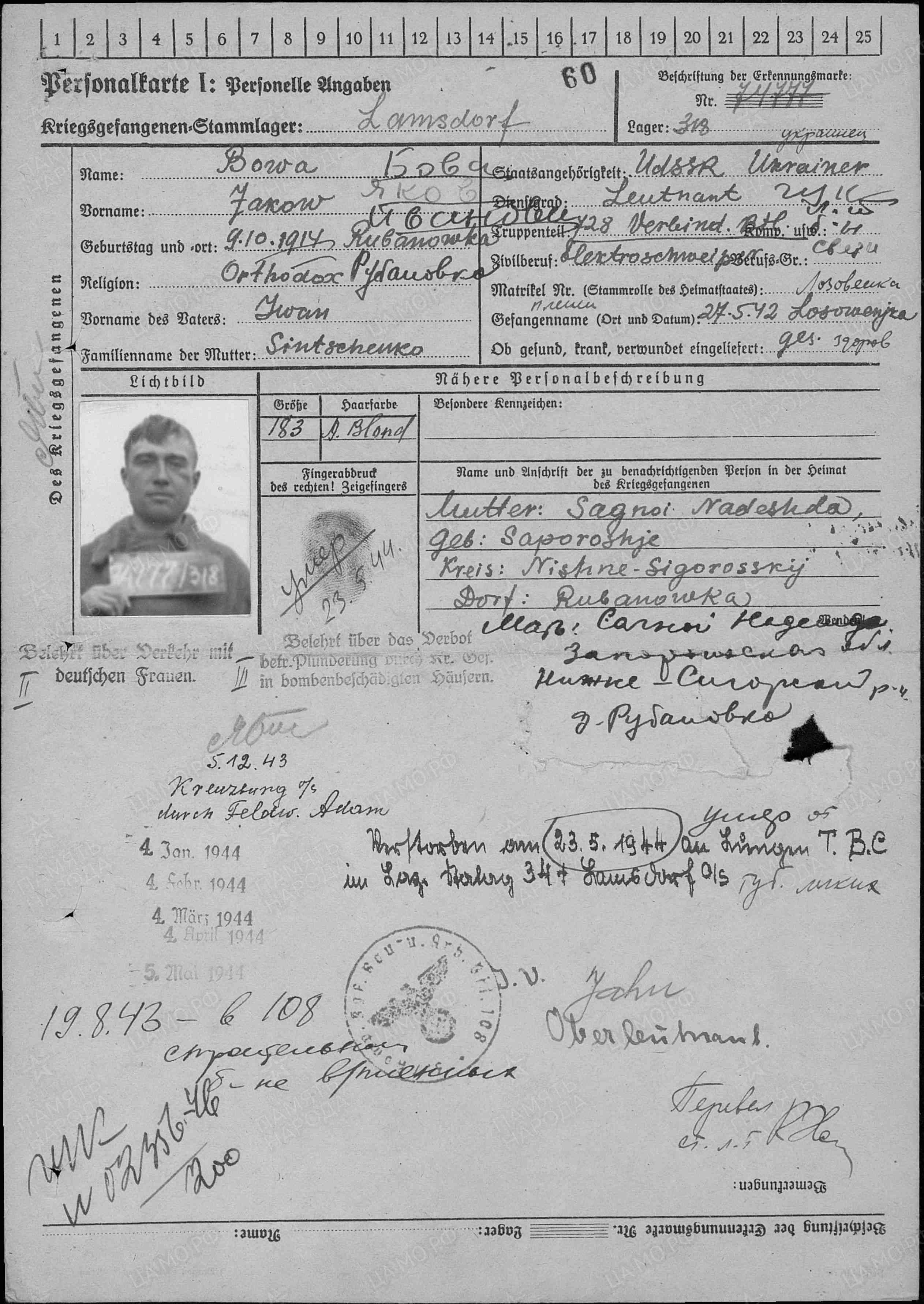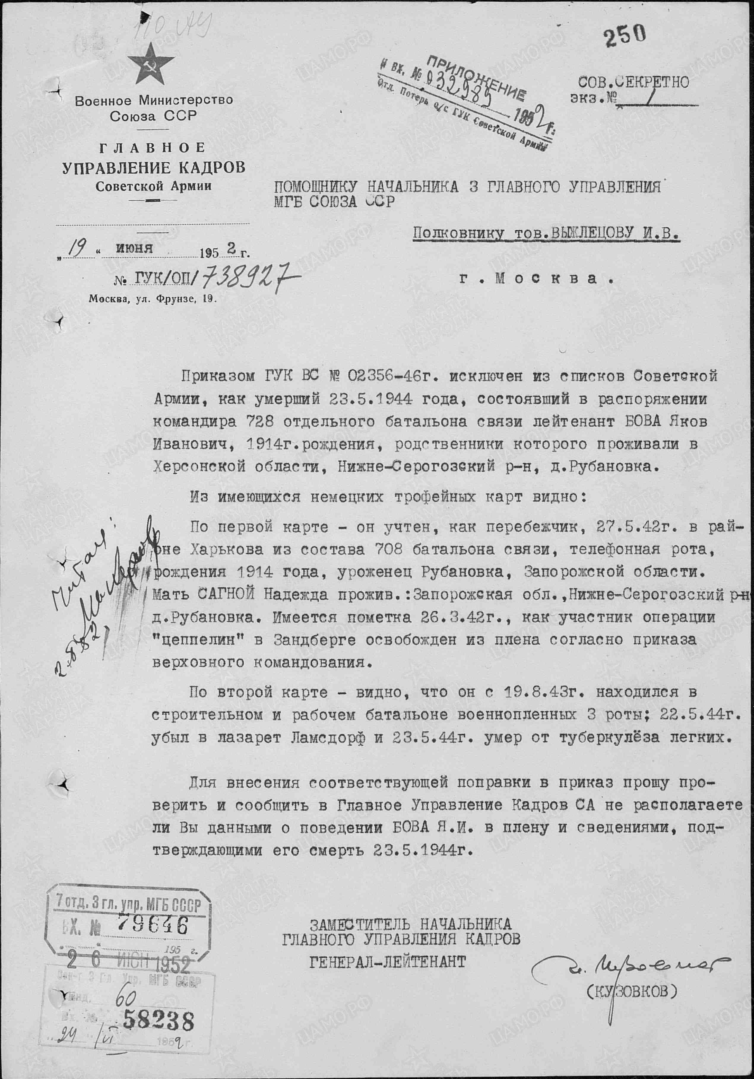 Фамилия Бова Имя Яков Отчество Иванович Дата рождения/Возраст 09.10.1914 Место рождения Запорожская обл., Рубановка Дата пленения 27.05.1942 Место пленения Харьков Лагерь лаг. 358 Лагерный номер 36122 Судьба погиб в плену Воинское звание лейтенант Дата смерти 23.05.1944 Название источника донесения ЦАМО Номер фонда источника информации 33