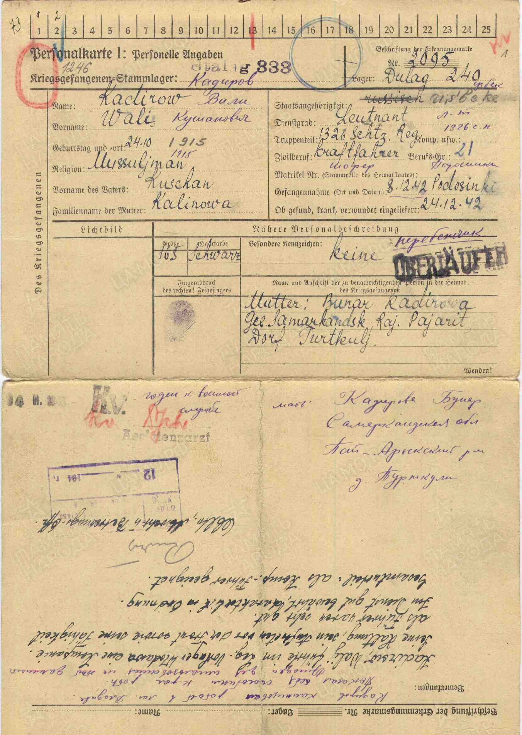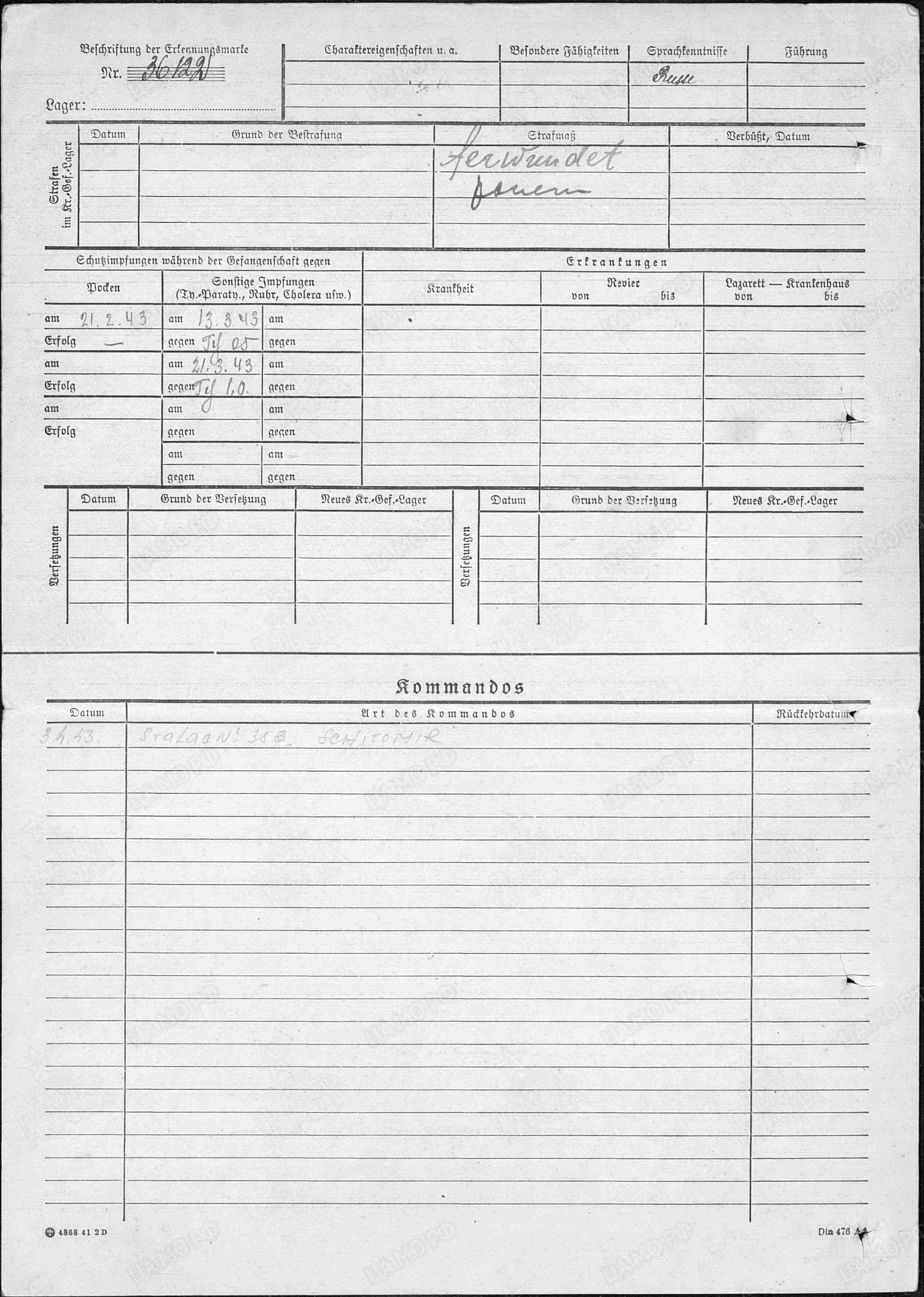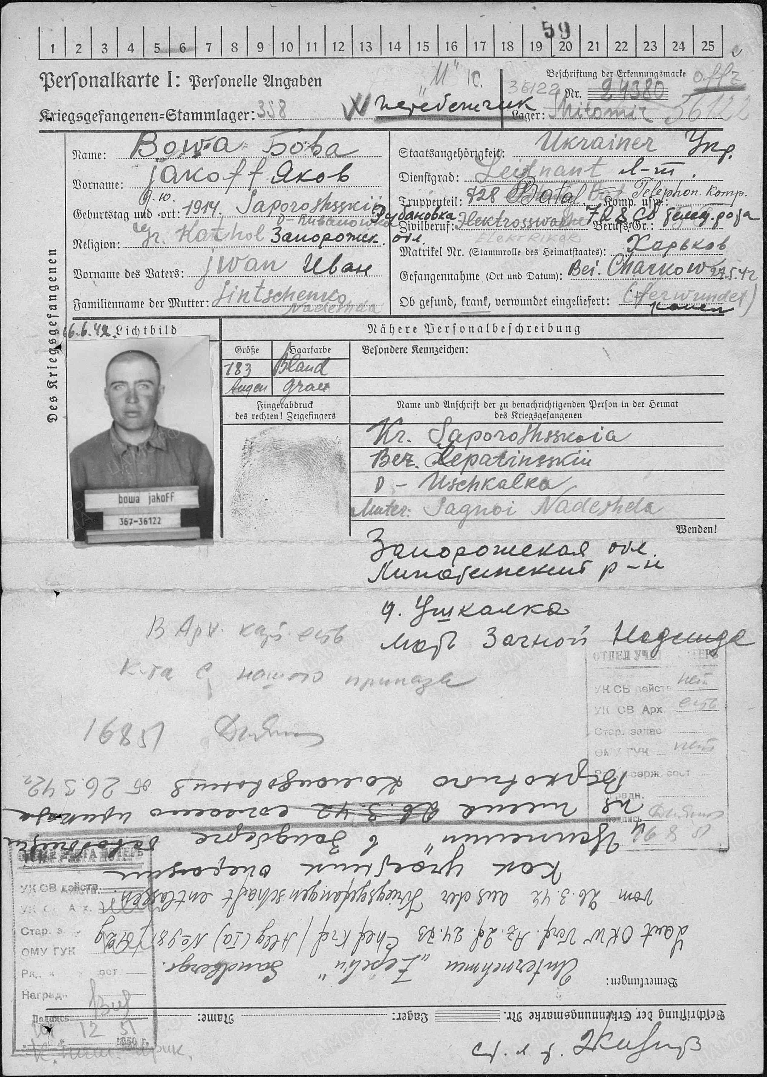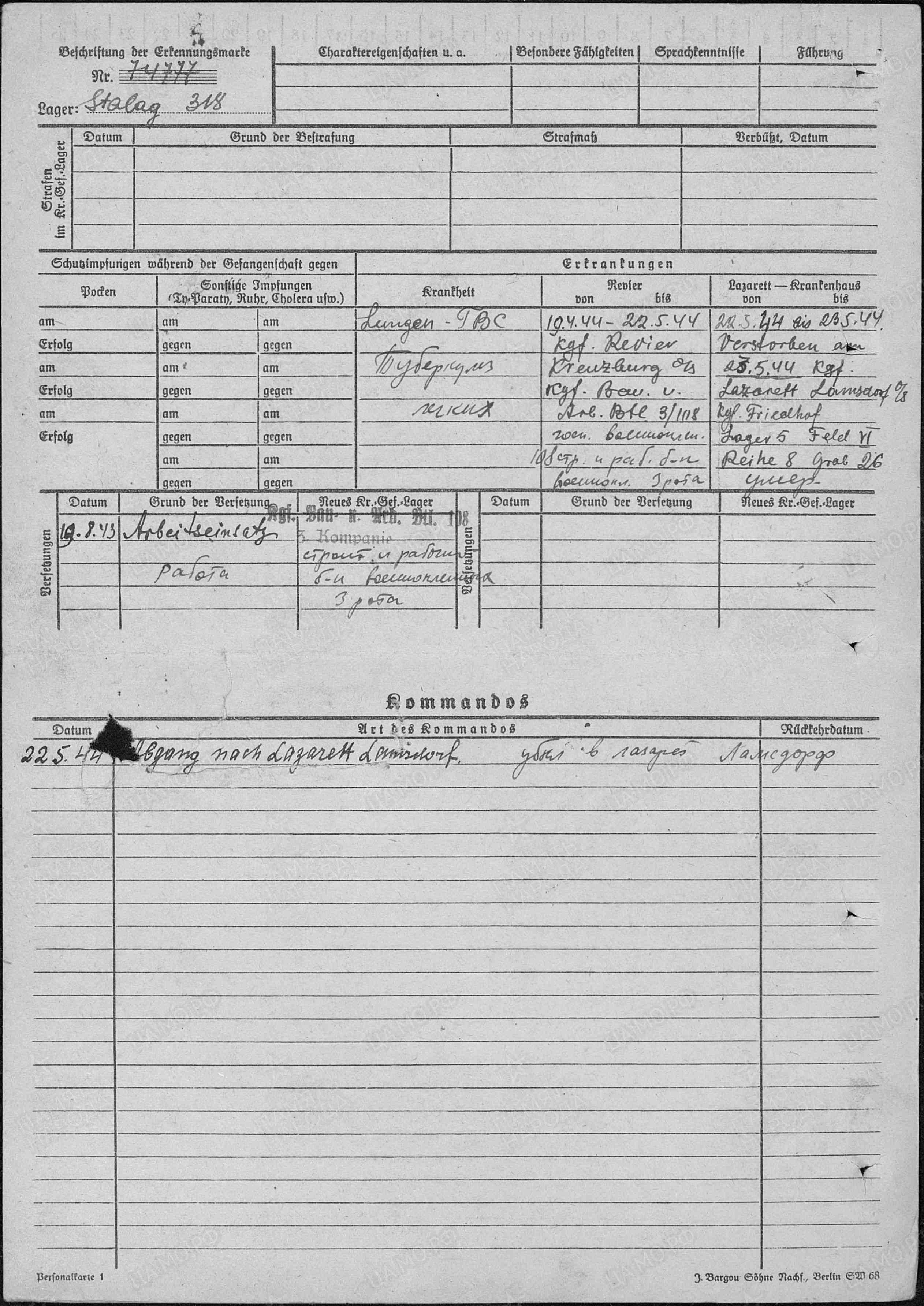 Вот тот редчайший случай когда есть обе ПК на перебежчика-в/п, освобожденного из плена и отправленного в "Цепелин", возвращенного назад в Шталаг и умершего там. Штампика экс.лега нет, но он и не "поехал по их маршруту" где их ставили. И это все пока открывается в ОБД. Подсмотрено у Геннадия в теме "Горькая участь перебежчиков".