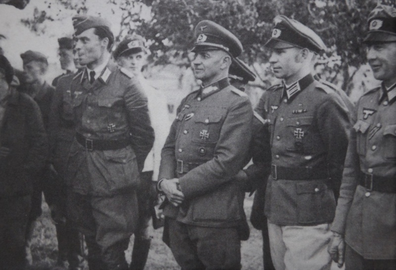 Генерал-майор Оскар фон Нидермайер (Oscar Ritter von Niedermayer, 1895-1948; в центре) и руководитель подотдела организационного отдела Генерального штаба Верховного главнокомандования сухопутных сил Германии майор Клаус Филипп Мария Шенк фон Штауффенберг (Claus Philipp Maria Schenk Graf von Stauffenberg, 1907-1944; стоит слева от Нидейрмайера) на смотре "восточных легионов" в учебном лагере на Украине. Сентябрь 1943г.