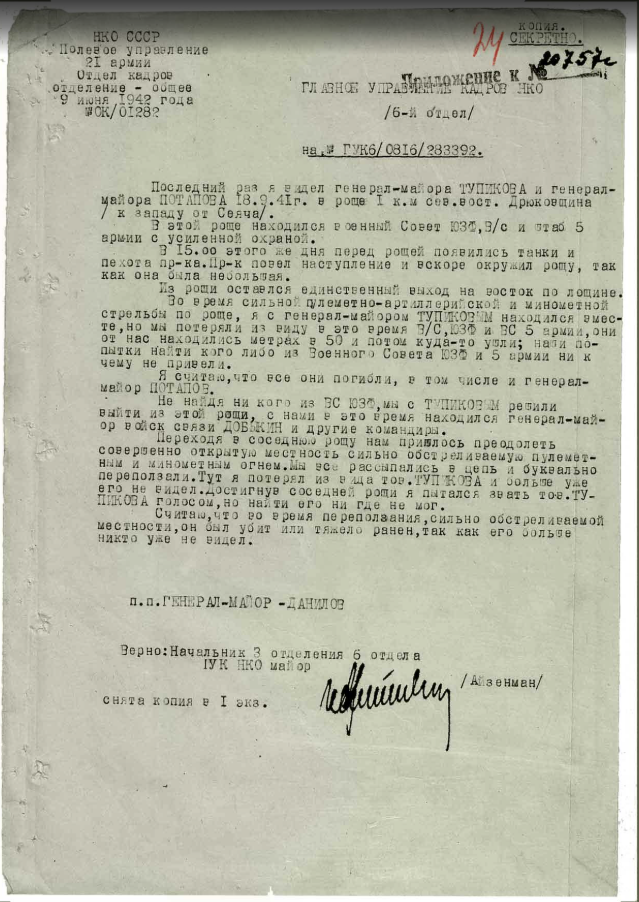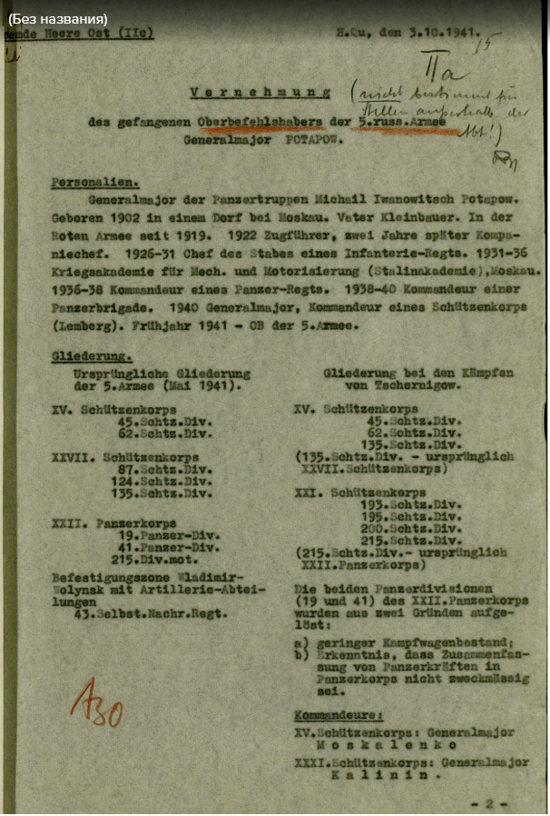Допрос командующего 5 русской армии генерал-майора Потапова. Генерал-майор танковых войск Михаил Иванович Потапов. Рождён в 1902 в деревне, у Москвы. Отец - крестьянин. В Красной Армии с 1919 года. В 1922 - командир взвода, 2 года позже - командир роты. 1925-31 начальник штаба пехотного полка. 1931-35 Военная Акакдемия мех.и моторизиррования (Сталинская академия), Москва. 1936-38 командир танкового полка. 1938-40 командир танковой бригады. 1940 Генерал-майор, командир стрелкового корпуса (Лемберг). С начала 1941 года командующий 5 армией. Численность 5 армии(май 1941) 15 корпус 45стр.дивизия 62 стр.дивизия