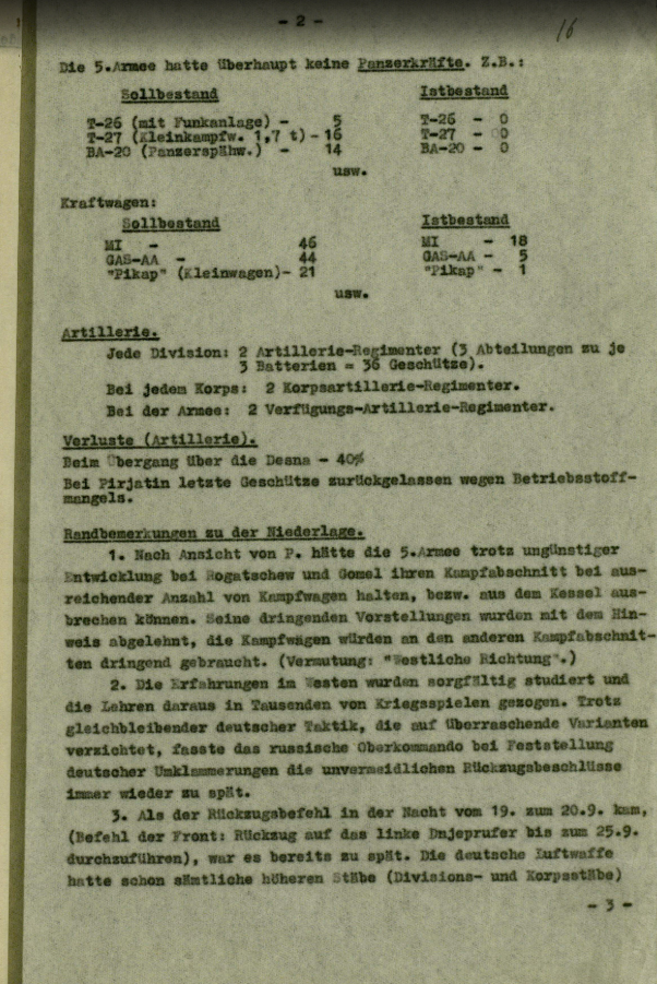 Численность в боях у Чернигова 15 стр.корпус 45 стр.дивизия 62 стр.дивизия 135 стр.дивизия (135 стр.дивизия передана от 27стр.корпуса) 21 стр.корпус 193стр.дивизия 195 стр.дивизия 200 стр.дивизия 215 стр.дивизия (215 стр.див передана из 22 танкового корпуса) Обе танковые дивизии(19 и 41) 22 танкового корпуса были разделены на 2группы: а) слабо бронированные боевые машины б) сводные части танковых корпусов Командиры: 15 стр.корпус:Генерал майор Москаленко 31 стр.корпус:Генерал майор Калинин 5 армия Должна иметь Т - 26 с радио-5 Т-27,1,7т -16 БА -20 (бронемашина)-14 Наличие Т-25-0 Т-27-0 Ба-20-0 Боевые машины: М-46 Газ АА - 44 "Пикап"(небольшая машина)-21 Наличие: М-18 Газ АА-5 "пикап"-1 Артиллерия: Каждая дивизия: 2 арт.полка (3 части ,по 3 батареи-36 орудий) Каждый корпус: 2корпусных арт.полка. В армии: 2 подчинённых полка . Потери артиллерии: При переправе через Десну 40% У Припяти оставлены последние орудия из за отсутствия топлива. Части боеспособные. 1.По мнению Потапова 5 армия была ещё сильна у Рогачёва и Гомеля,свои позиции армия удерживала при помощи своих боевых машин и смогла бы вырваться из котла. 2.Опасность с запада рассматривалась(до войны) и тысячи раз проигрывалось в учениях.Но немецкая тактика,неожиданные удары,всё время ставили командование армии в положение,когда командование реагировало неправильно или с опозданием. 3. По приказу для отступления 19на 20.9(приказ командования фронтом о отступлении на линию Днепровского берега) ,части получили слишком поздно.Авиация немцев уже основные высшие штабы (дивизионные и корпусные) 5 армии ,так сильно разбомбила,что связь между частями была нарушена.Приказы до частей больше не доходили.Снабжение продовольствием ,боеприпасами к 20.9 было очень плохое.Части сильно устали. 4. Основанием катастрофического положения 5 армии стала русская авиация: Армии для проведения операций были выделены 3 авиационные дивизии. На самом деле использована была только 62 авиадивизия с 60 самолётами (2х моторные самолёты"СБ"). На запрошенные 240 самолётов были подчинён только один авиаполк. Потери: Численность пленных значительно меньше чем убитых и раненых.На взгляд Потапова,их число около 700000. Много попало в плен в окружении. 5 армия была численностью около 200000 солдат и офицеров. Потери до середины сентября составили 5000 убитыми и 41000 ранеными.Это число стоит 4 к 1. С нашей поправкой с оглядкой на прошедшие бои на другой полосе фронта потери составляют 700.000 Захвачено: Число захваченных нами танков- 17.500, не точно отражает картину, так как 70% это обучающие танки, с февраля месяца 1941 не было получено ни какого пополнения техникой. Потери под Киевом и под Ленинградом важнее. Но Харьков (выпускает танки Т-34),все мощности сохранил и направил свои заводы на Москву,Коломну,Краматорскую,Ростов,Баку,Ворошиловград,Горки,Сталинград,Саратов,Молотов(Пермь) и заводы в уральском районе и Сибири(Новосибирск),Омск,Свердловск и Челябинск. Пополнение: Оно не проводилось,большая часть боевых частей были разбиты. Но резервы не были получены. 5 армия(так же как и другие армии под Киевом: 6,12,26 и 38) не получали пополнения,за исключением по 1 маршевому батальону из Западной Сибири,Орла и Северного Кавказа. По мнению Потапова,(это выглядит фантастично,) но русский народ может поставить под ружьё 27 миллионов солдат.15% из 180 миллионов(статистика 193 миллиона-после захвата Бесорабии и Балтийских стран).