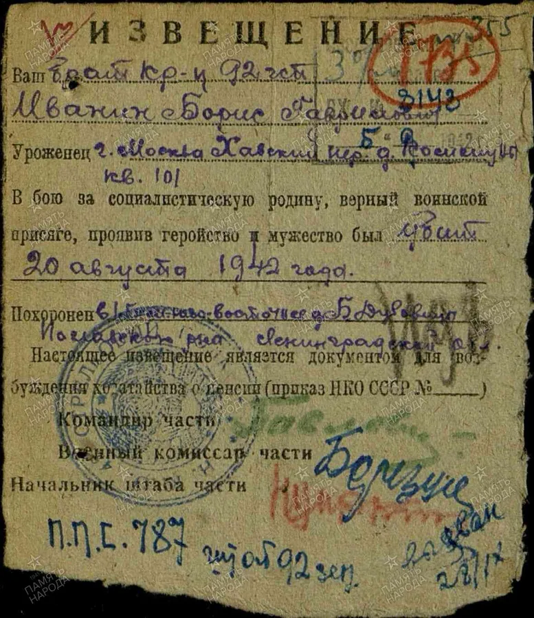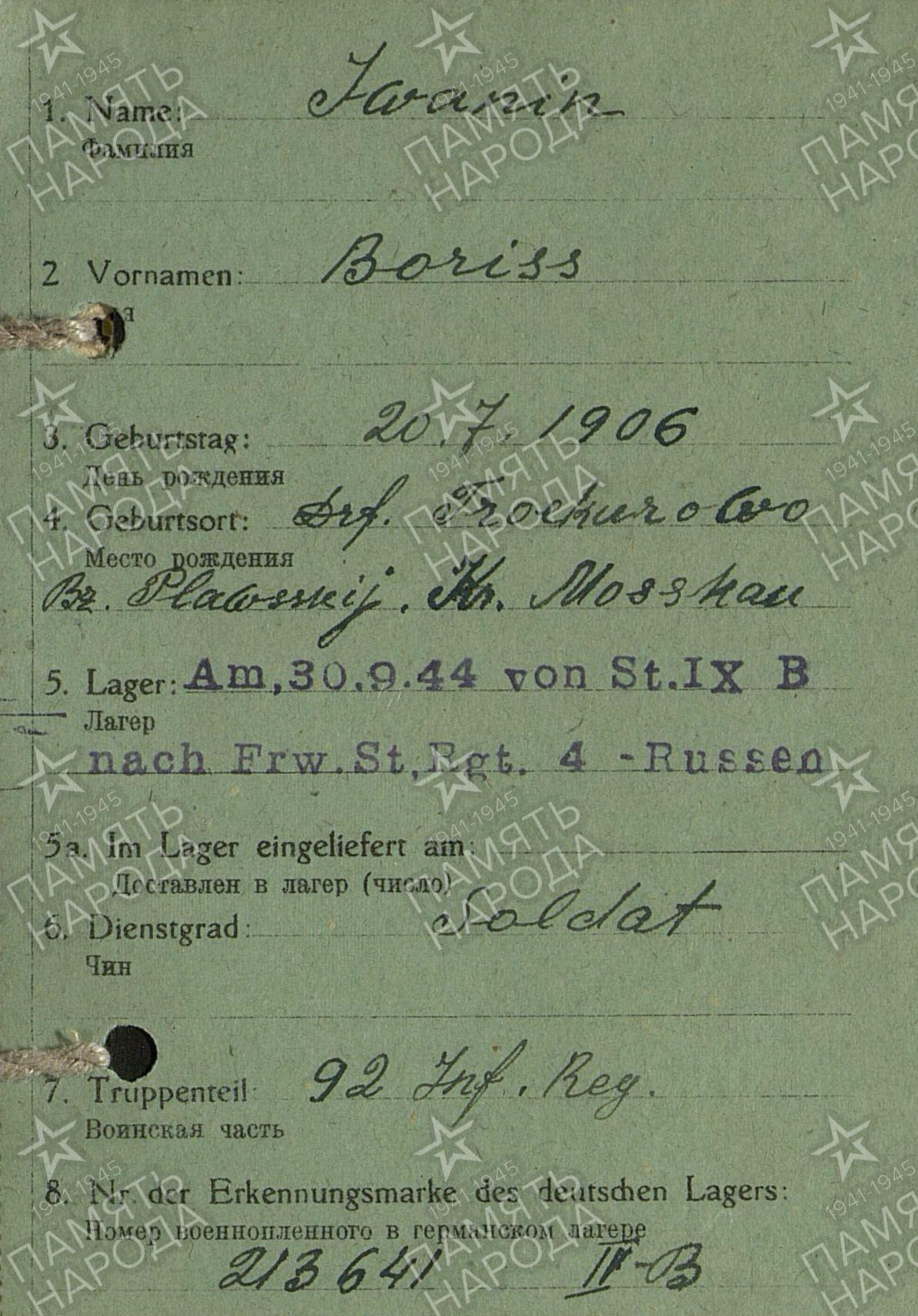 Информация о военнопленном ID 1978050216 Фамилия Иванин Имя Борис Отчество Гаврилович Дата рождения/Возраст 20.07.1906 Место рождения Московская обл., Плавский р-н, д. Троекурово Дата пленения 20.08.1942 Место пленения Калинин Лагерь шталаг 344, шталаг IV B, шталаг IV A, шталаг IX B Лагерный номер 213641 Судьба попал в плен Последнее место службы 92 сп Воинское звание рядовой Название источника донесения РГВА https://obd-memorial.ru/html/info.htm?id=1978050216&p=2