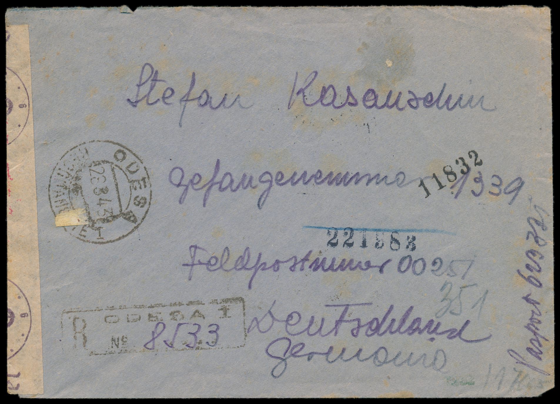 Приднестровье, 4 специальные марки Приднестровья достоинством 24 лея на обороте заказного письма со штемпелем Одесского командования I от 28.08.43 и R-штампом Одесса 1 с рукописным регистрационным номером военнопленному с немецким номером полевой почты 00251 = Dulag 240 (в Борисове / Украина), транзитный штемпель Бухареста, штемпель румынской цензуры и немецкой цензуры Вены, немецкий штемпель прибытия полевой почты 16.09.43 с идентификационным номером 351 = полевая почта 758 zw, по-видимому, доставлено.