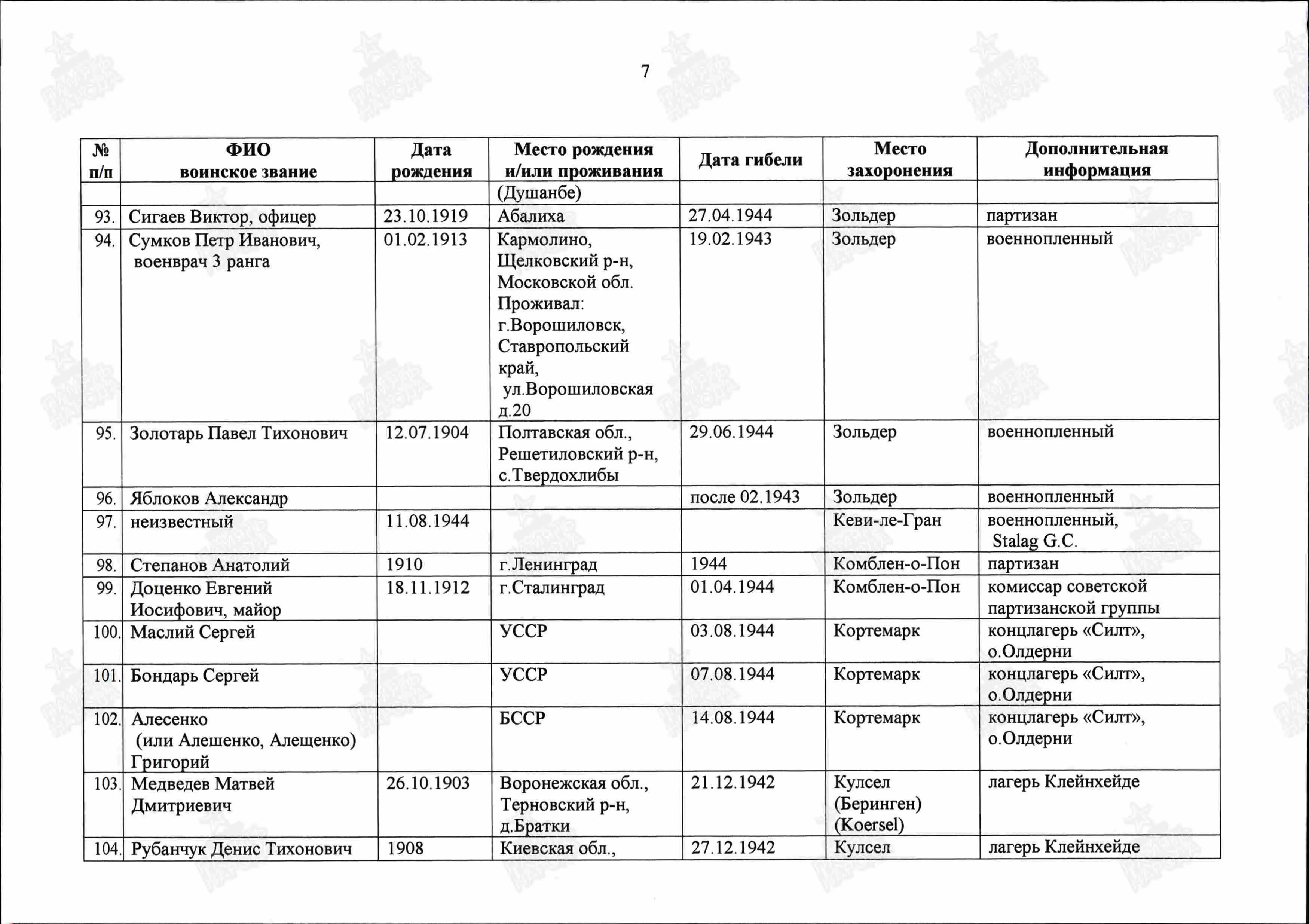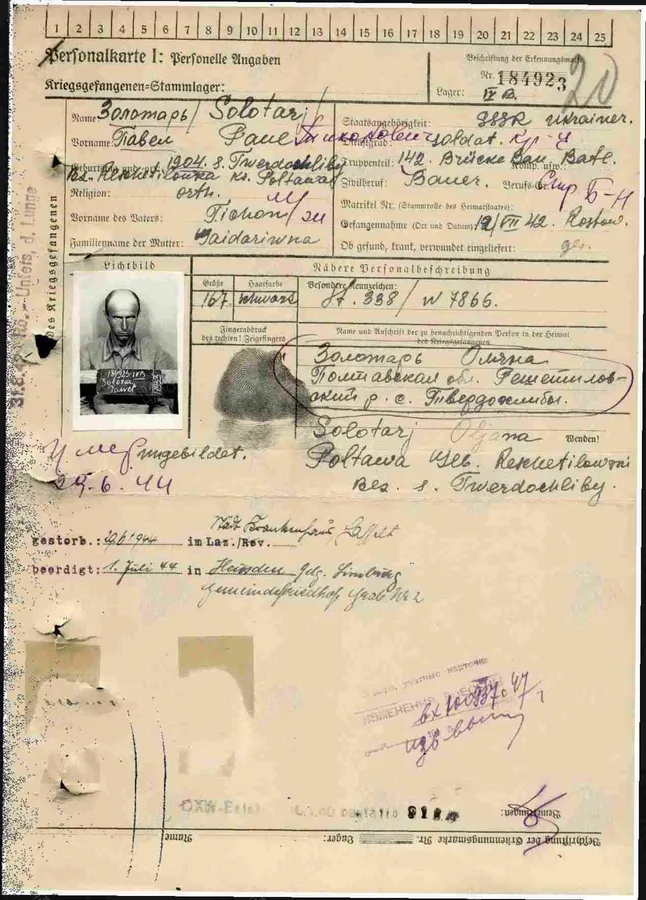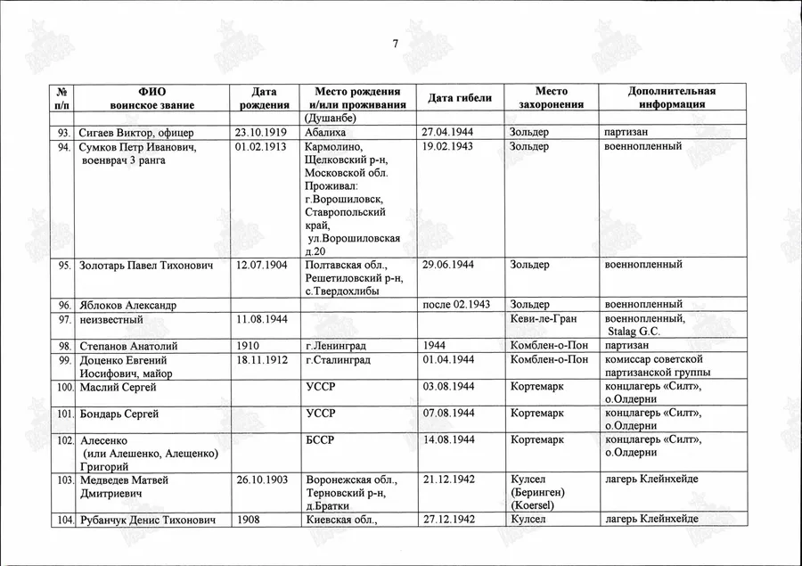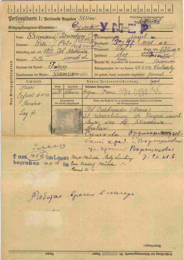Фамилия Гущенков Имя Алексей Отчество Семенович Дата рождения/Возраст __.__.1924 Место рождения Смоленская обл. Лагерный номер 181220 Дата пленения 12.07.1942 Место пленения Старобельск Лагерь шталаг IV B Судьба Погиб в плену Воинское звание солдат (рядовой) Дата смерти 24.07.1943 Место захоронения Керзель Могила могила 258 Фамилия на латинице Guschtschenkow Название источника информации ЦАМО Номер фонда источника информации 58 Номер описи источника информации 977520 Номер дела источника информации 2170 https://www.obd-memorial.ru/html/info.htm?id=300272000 Николай Викторович 14 ОА ПВО 1974-1976 У России только два союзника - это Армия и Флот