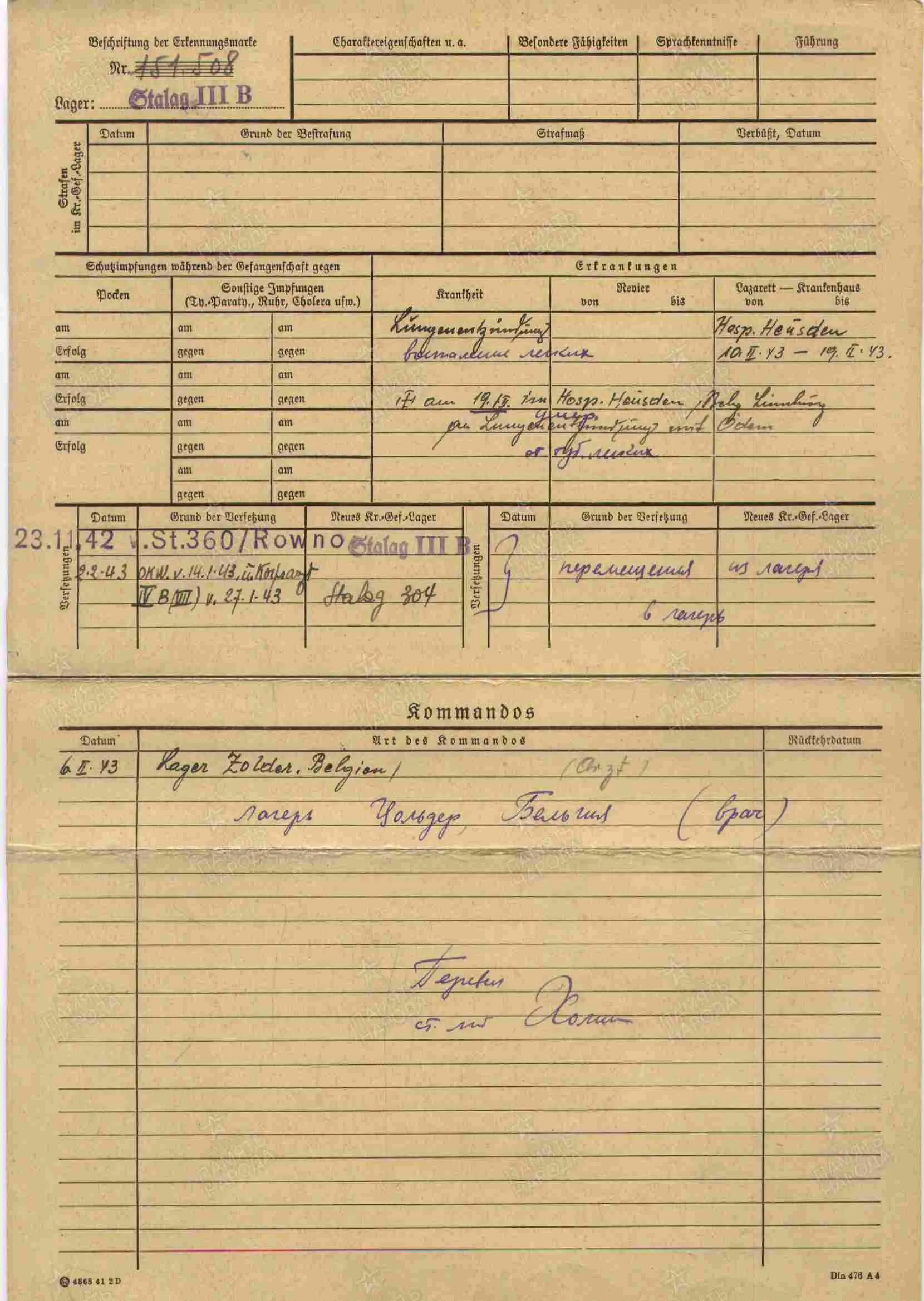 Документ о военнопленных Дата рождения __.__.1913 Место рождения РФ, Московская область Последнее место службы 332 мед.-сан. б-н Дата выбытия 19.02.1943 Причина выбытия погиб в плену Воинское звание военврач Место пленения Балаклея Лагерь шталаг III B Лагерный номер 151508 Дата пленения 25.05.1942 Биография погиб в плену Источник информации ЦАМО Фонд ист. информации Картотека военнопленных офицеров